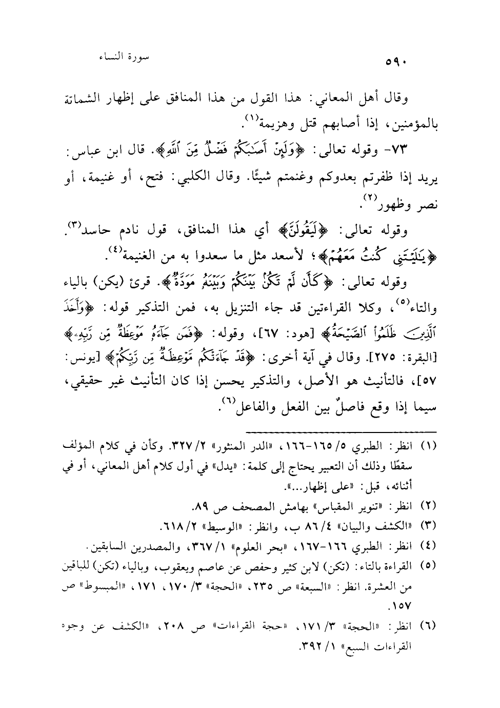 (¬3) هكذا هذِه العبارة وفيها ركاكة بالتكرار، وعبارة الزجاج في "معانيه" 2/ 76: "ومعنى المودة ههنا، أي كأنه لم يعاقدكم على الإيمان، أي كأنه لم يظهر لكم المودة، وجائز أن يكون والله أعلم: ليقولن: يا ليتني كنت معهم كأن لم تكن بينكم وبينه مودة، أي كأنه لم يعاقدكم على أن يجاهد معكم". وانظر: القرطبي 5/ 276.