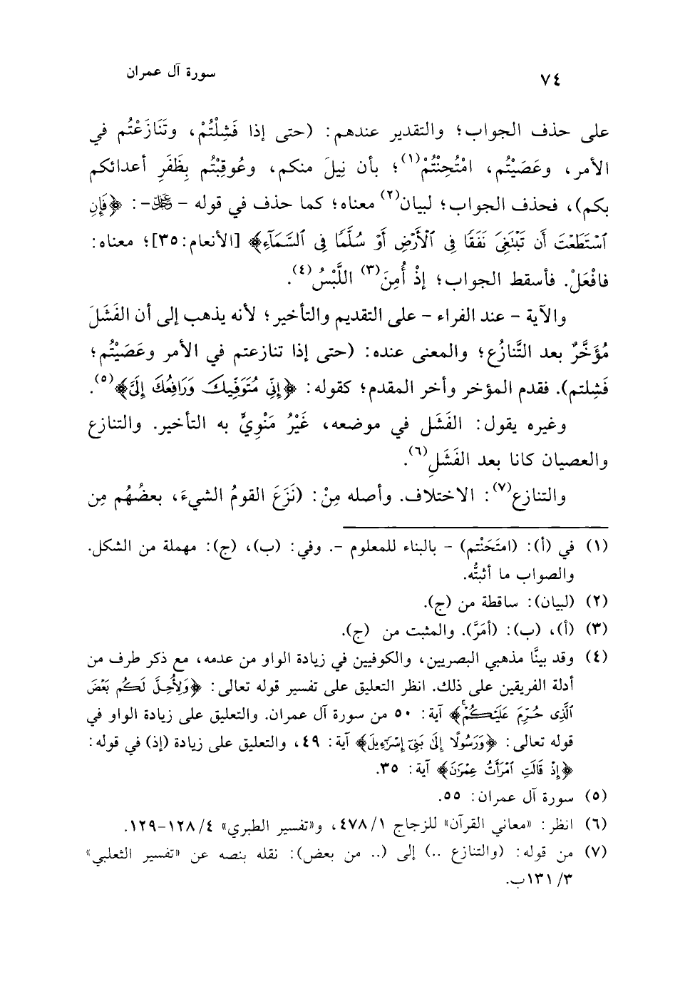 وقوله تعالى: {ثُمَّ صَرَفَكُمْ عَنْهُمْ} [أي] (¬2): بالهزيمة؛ على معنى: صَرَفَ وجوهَكُم عنهم (¬3).