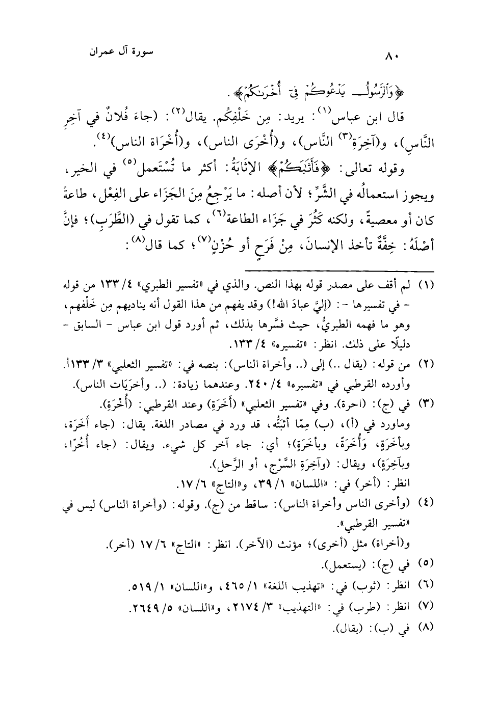 وفي "طبقات فحول الشعراء" (فلما خشينا ..). وورد في كل المصادر -ما عدا "تفسير الثعلبي"-: (سُمْرا) بدلا من: (فُتلا) التي لا تستقيم مع قافية القصيدة الرائية. واتفقت رواية المؤلف للبيت مع الثعلبي، مما يدل على أن المؤلف أخذ البِيت عنه.=