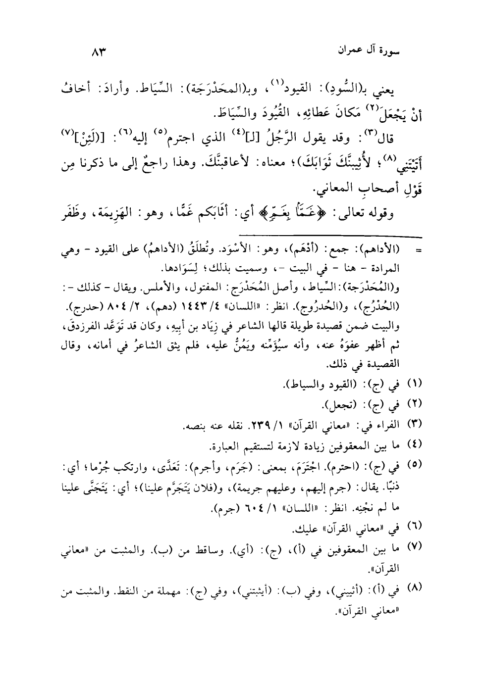 (¬4) انظر: "معاني القرآن" للأخفش 1/ 812، و"تفسير الطبري" 4/ 134، و"رصف المباني" 222، و"الجنى الداني" 40، 42.