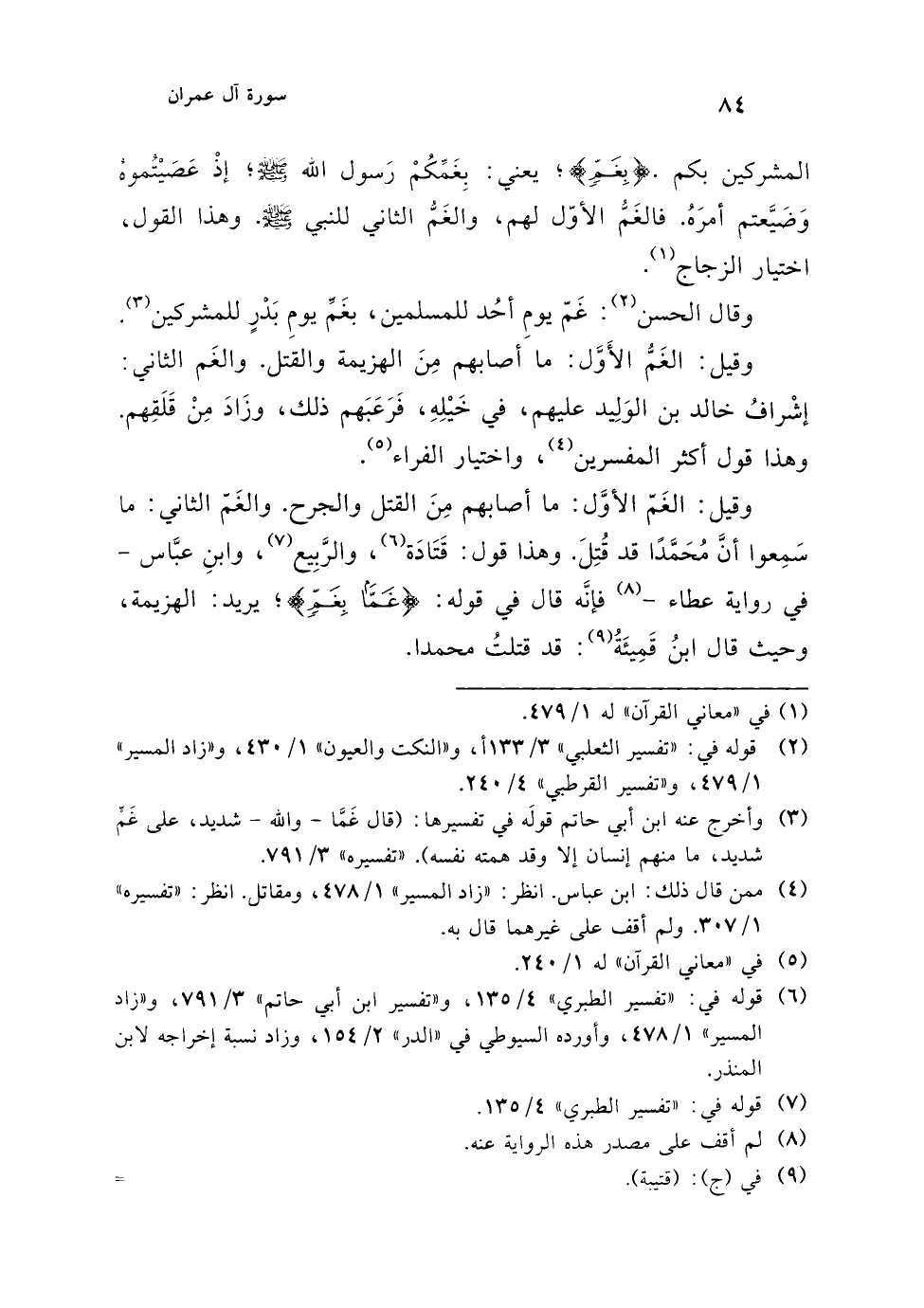 (¬7) لم أقف على من قال هذا القول بتمامه، إلا أن بعضه، وهو: أن الغم الأول: ما أصابهم من قتل وجراح، والغم الثاني: سماعهم قتل النبي - صلى الله عليه وسلم -. قد سبق وروده عند تفسير قوله تعالى: {غَمًّا بِغَمٍّ} آية: 153.
