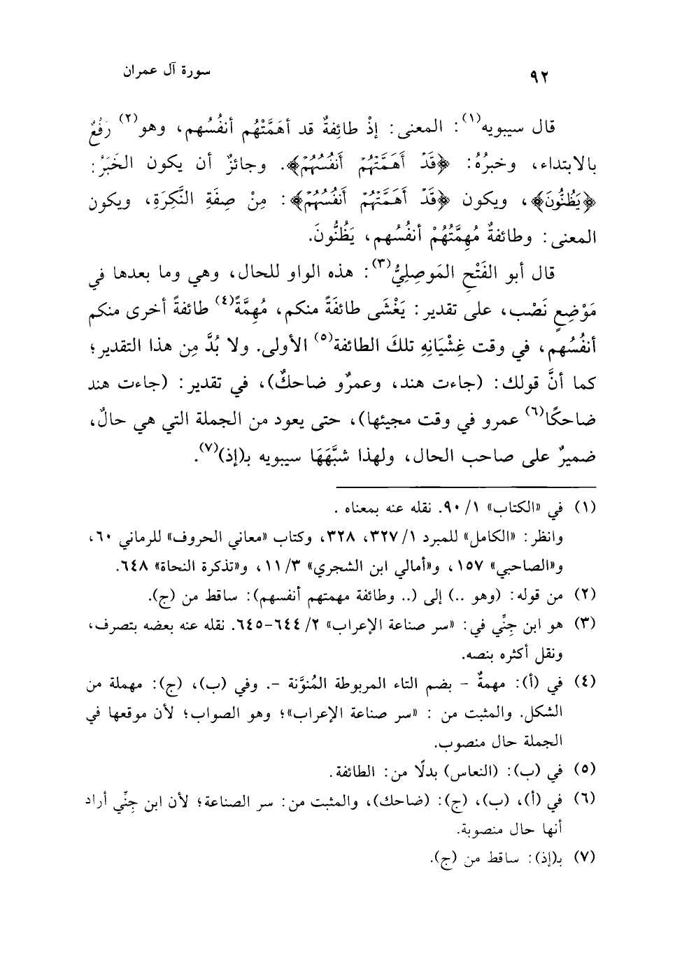 (¬1) لفظه عند ابن أبي حاتم: (.. ذلك المنافق، لما قُتِل مِن أصحاب محمد، أتَوا عبد اللهَ بن أبَي، فقالوا له: ما تَرَى؟ فقال: إنَّا والله ما نُؤامَر، لو كان لنا من الأمر شيء ما قتلنا ههنا). وما أورده المؤلف هو معنى هذا اللفظ.