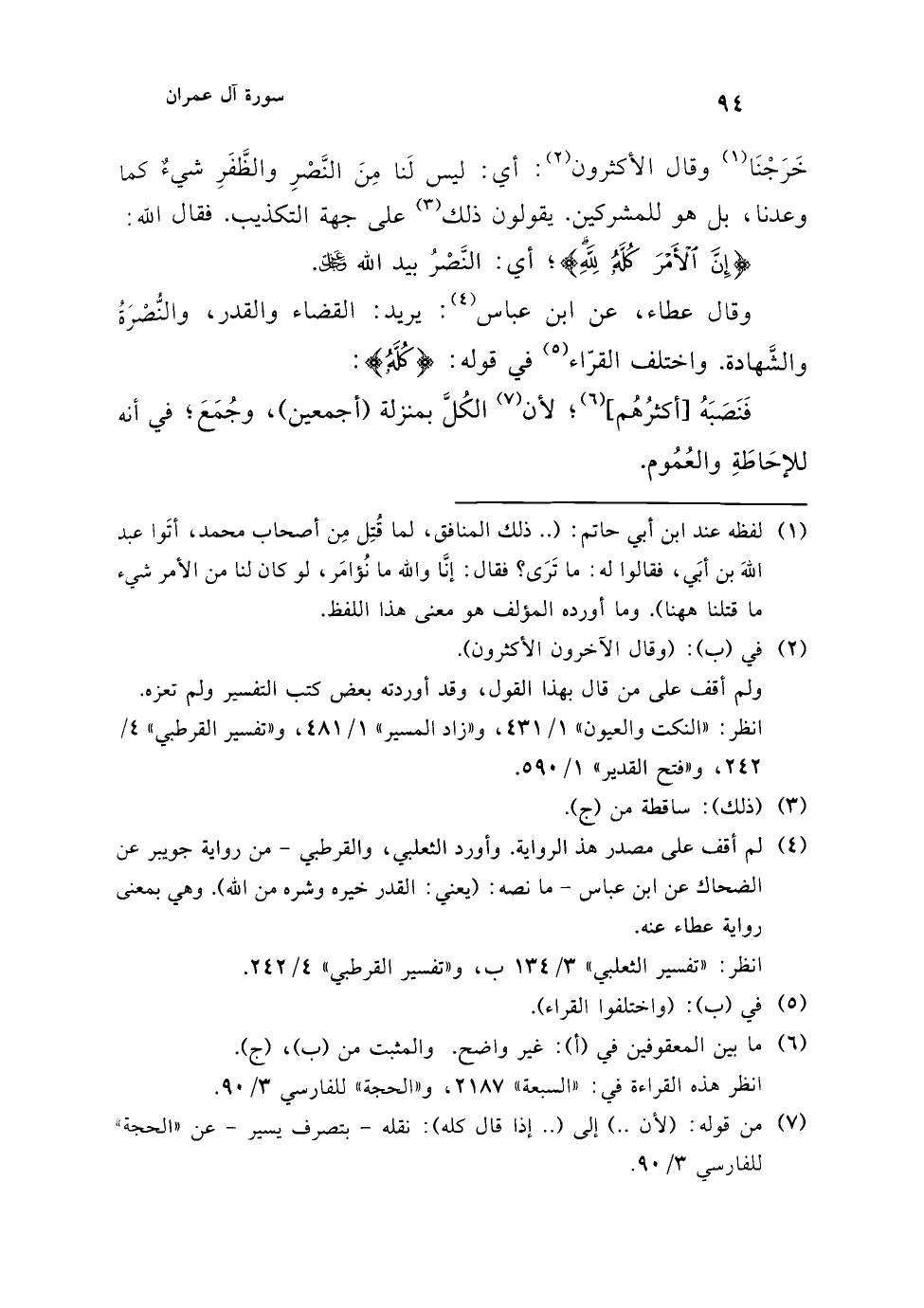 (¬3) انظر: "تفسير الطبري" 4/ 142، و"تفسير الثعلبي" 3/ 134 ب، والنَّصُّ له.