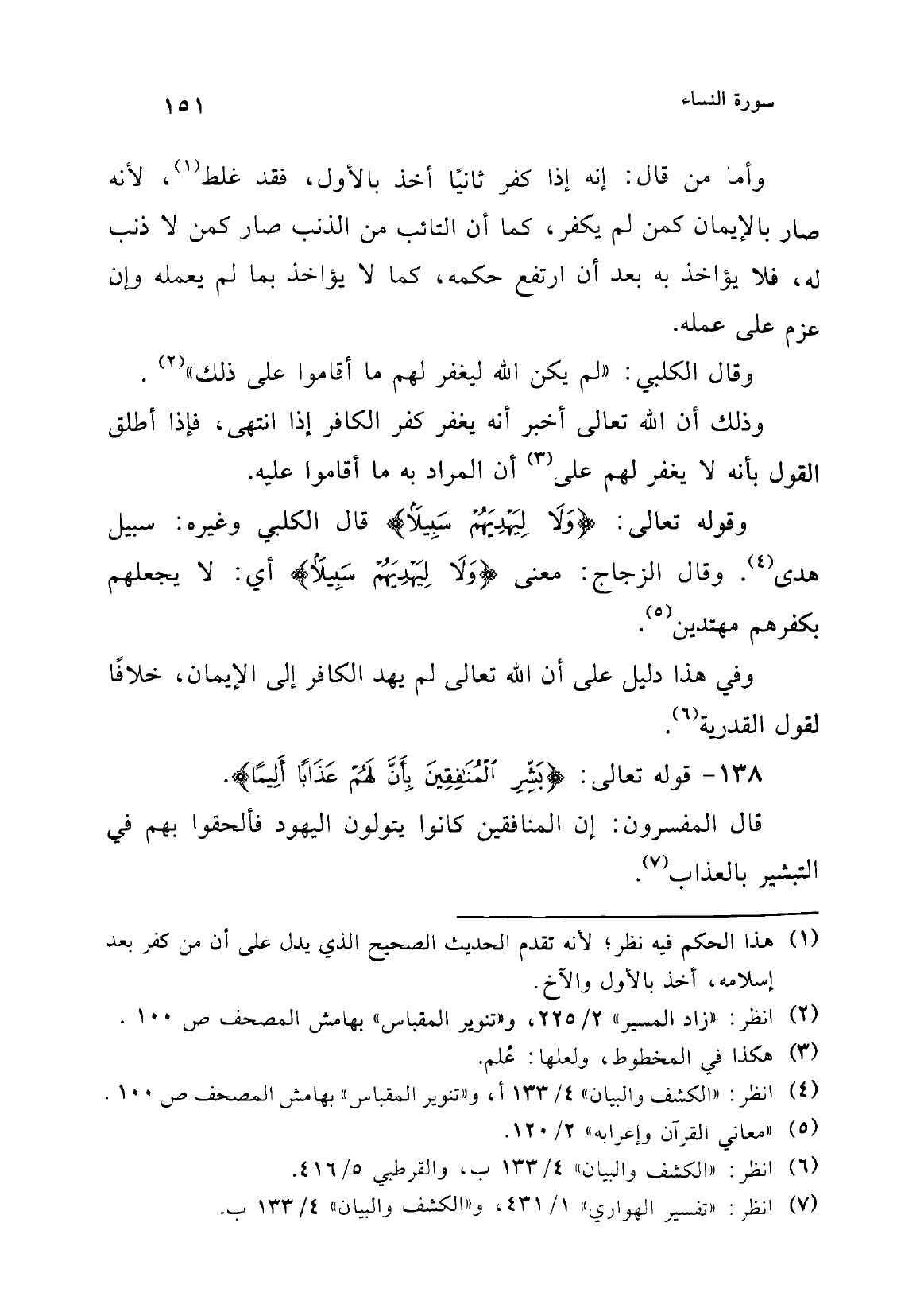 والكلبي فسر العزة في قوله: {أَيَبْتَغُونَ عِنْدَهُمُ الْعِزَّةَ} بالظهور على محمد وأصحابه (¬2). وهو راجع إلى معنى القوة، يعني: أيطلبون أن يتقووا بهم فيظهرون على المسلمين.
