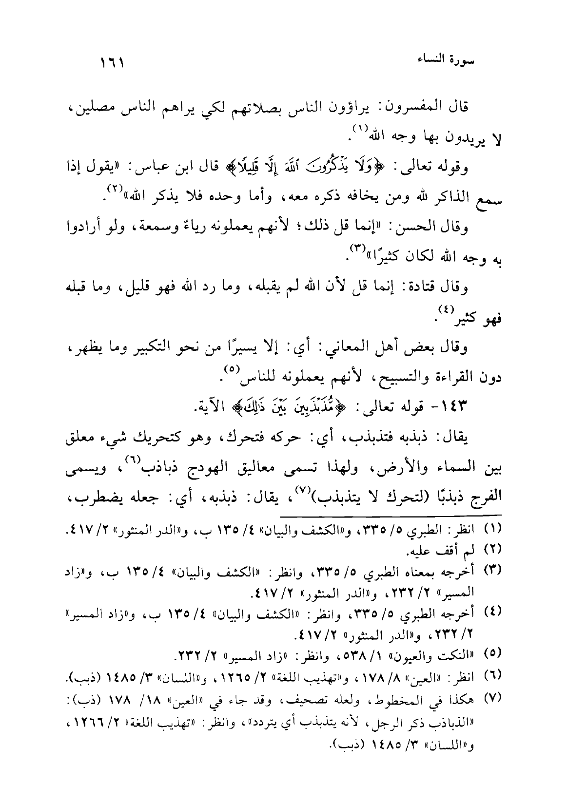 قال أهل المعاني: معنى {مُذَبْذَبِينَ بَيْنَ ذَلِكَ} مترددين بين الكفر والإيمان، لا إلى المؤمنين بإخلاص الإيمان، ولا إلى المشركين فيخلصوا الشرك على الإظهار والإبطان (¬1).