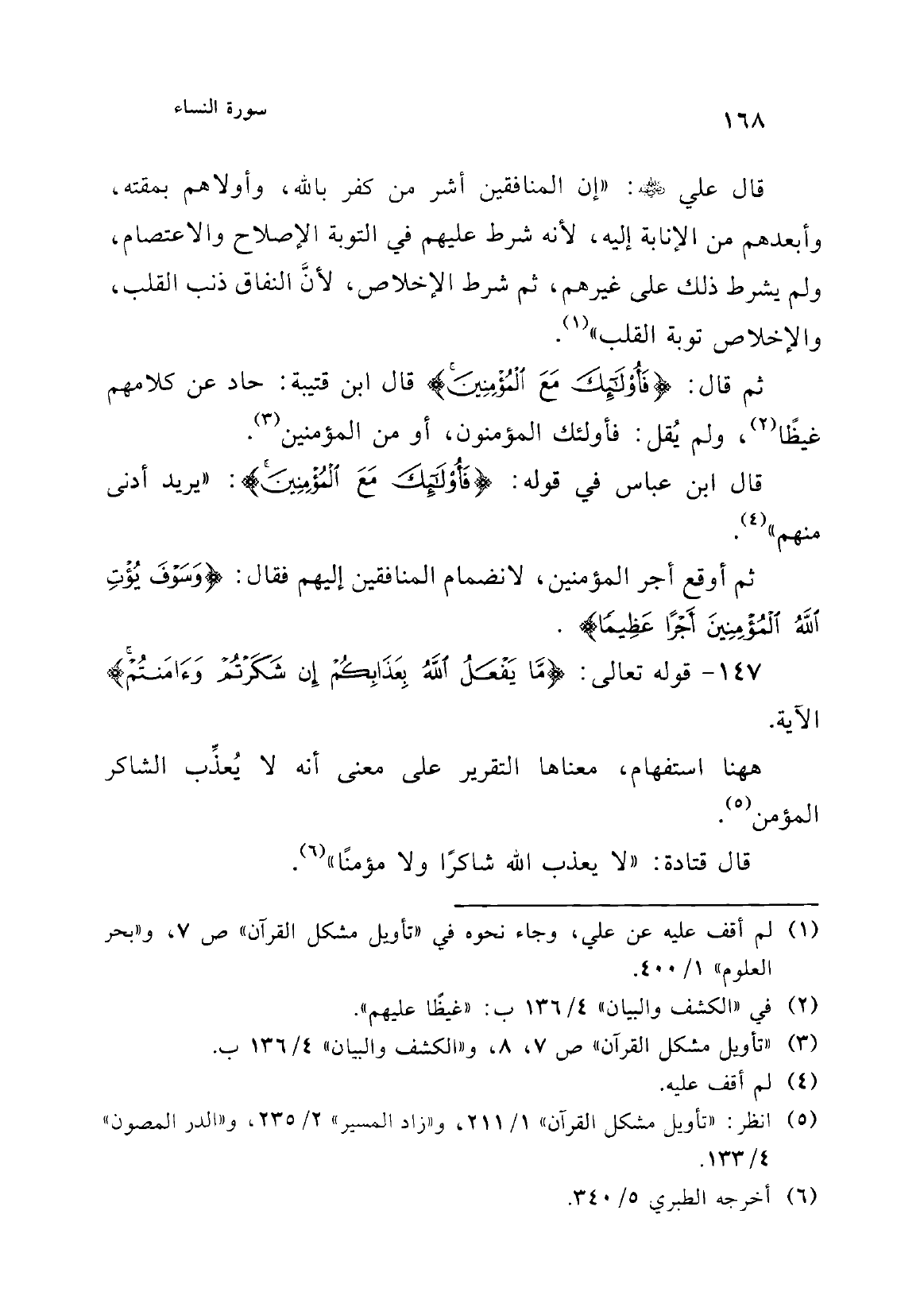 148 - قوله تعالى: {لَا يُحِبُّ اللَّهُ الْجَهْرَ بِالسُّوءِ مِنَ الْقَوْلِ} قال أهل المعاني: ولا غير الجهر أيضًا, ولكن يشبه أن تكون الحال أوجبت هذه القضية، كقوله: {إِذَا ضَرَبْتُمْ فِي سَبِيلِ اللَّهِ فَتَبَيَّنُوا} [النساء: 94] والتبيُّن واجب في الظعن والإقامة، ولكن الحال أوجبت ذلك.