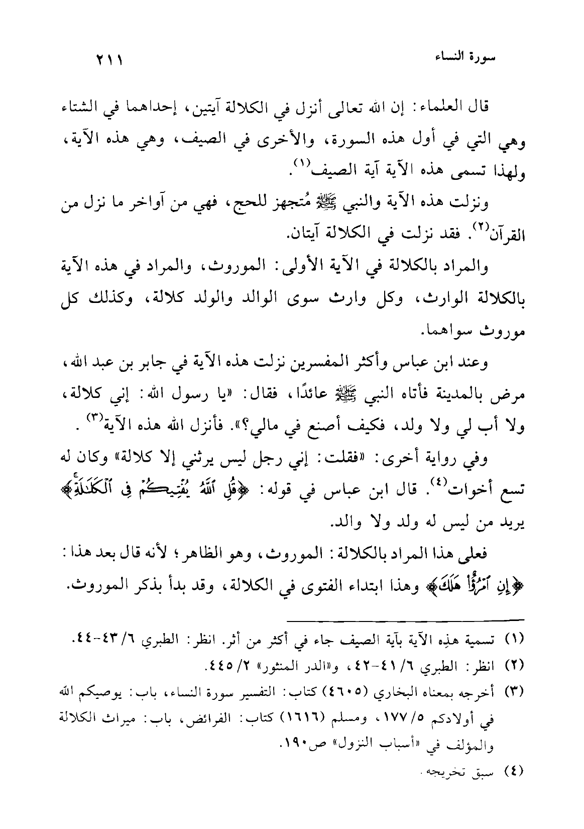 وروي أن أبا بكر الصديق -رضي الله عنه- قال في خطبته: ألا إن الآية التي أنزل الله في أول سورة النساء من شأن الفرائض أنزلها في الولد والوالد، والآية الثانية أنزلها في الزوج والزوجة والأخوة من الأم، والآية التي ختم بها سورة النساء أنزلها في الأخوة والأخوات من الأب والأم، والآية التي ختم بها سورة الأنفال أنزلها في أولي الأرحام بعضهم أولى ببعض في كتاب الله