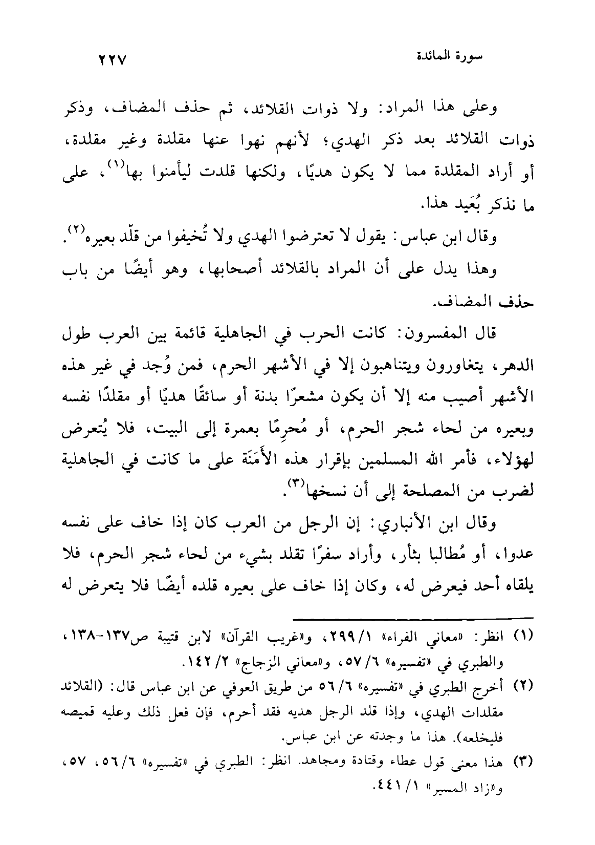 قال الفراء: كانت العرب إذا أرادت أن تسافر في غير الأشهر الحرم قلد أحدهم بعيره فيأمن بذلكن فقال لا تخيفوا من قلد، وكان أهل مكة يقلدون بلحاء الشجر، وسائر العرب تقلد بالوبر والشعر (¬2).