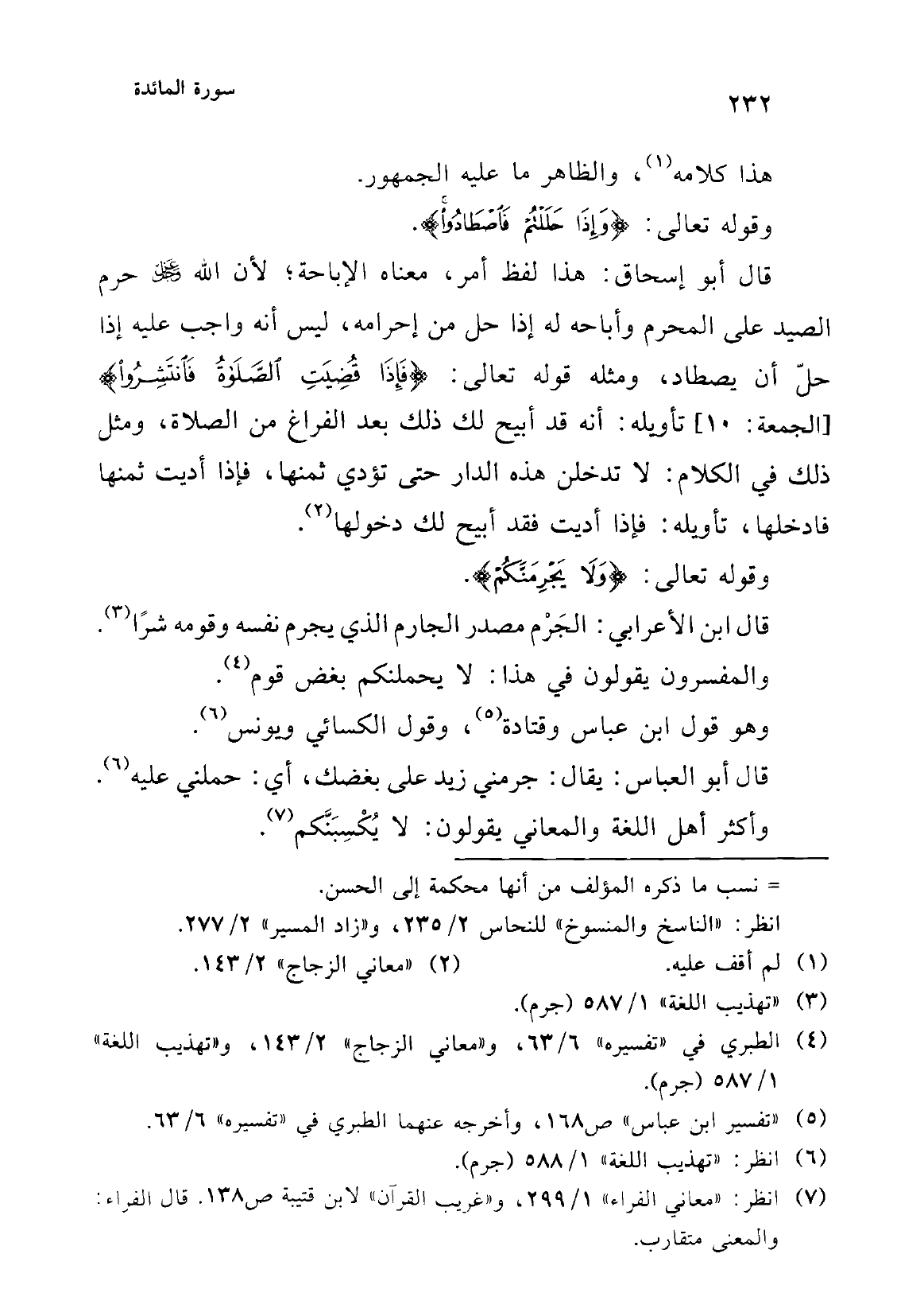 ولفظ النهي واقع على الشنآن، والمعنى بالنهي المخاطبون، كما قالوا: لا أرينك ههنا، {وَلَا تَمُوتُنَّ إِلَّا وَأَنْتُمْ مُسْلِمُونَ} [آل عمران: 102]، وكذلك: {وَيَا قَوْمِ لَا يَجْرِمَنَّكُمْ شِقَاقِي أَنْ يُصِيبَكُمْ} [هود: 89] (أن يصيبكم) المفعول الثاني، وأسماء المخاطبين المفعول الأول، ولفظ النهي واقع على الشقاق، والمعنيّ بالنهي المخاطبون. كذلك في هذه الآية، المفعول الأول: المخاطبون، والثاني قوله {أَنْ تَعْتَدُوا}، والمعني بالنهي المخاطبون، وإن كان لفظ النهي واقعًا على الشقاق، أي: لا تكتسبوا أنتم (¬2).