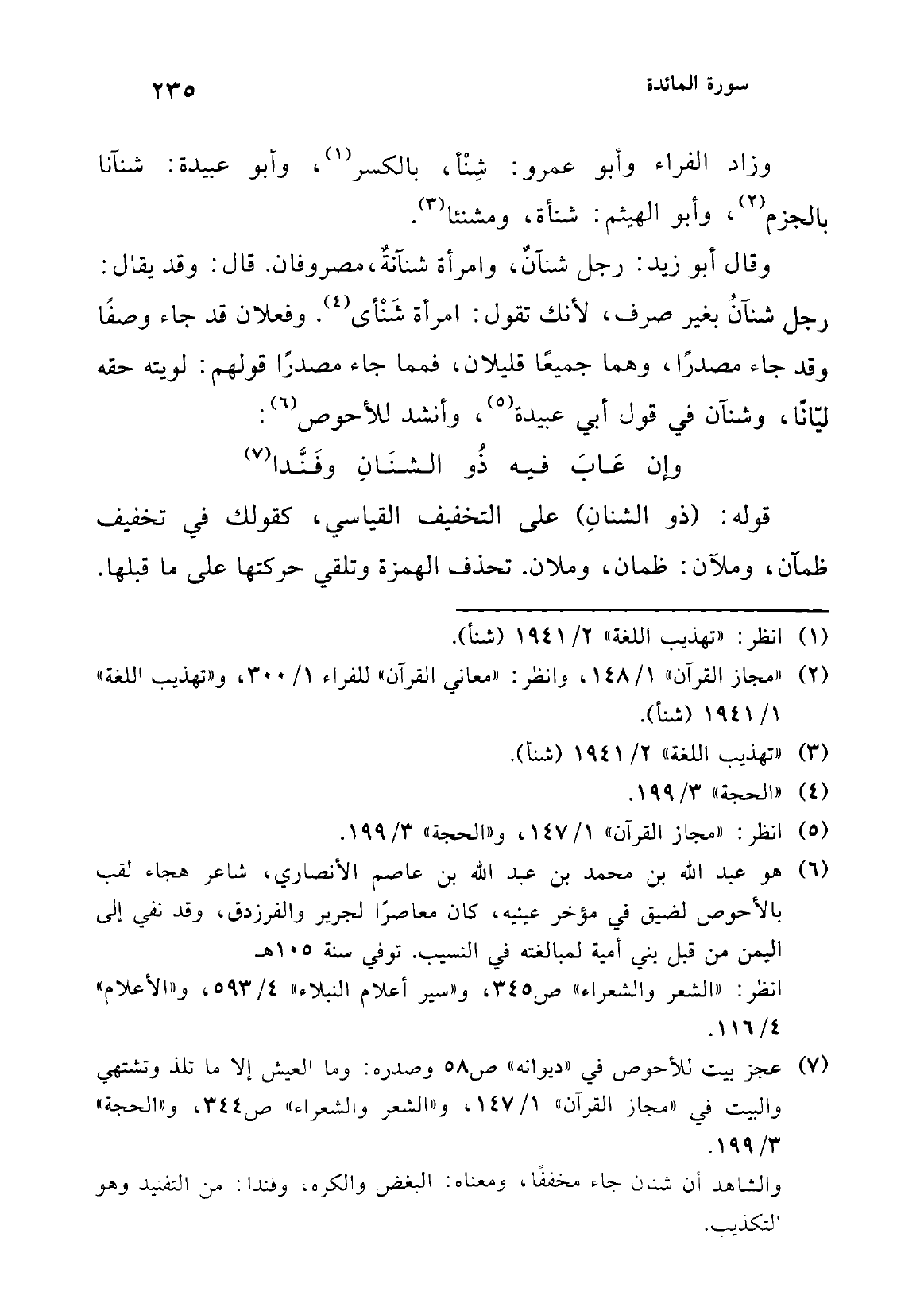 والمعنى: لا يجرمنكم بغض قوم -أي بغضكم قوما بصدهم إياكم ومن أجل صدهم أياكم- أن تعتدوا، فأضيف المصدر إلى المفعول وحذف الفاعل، كقوله تعالى: {مِنْ دُعَاءِ الْخَيْرِ} [فصلت: 49]، و {بِسُؤَالِ نَعْجَتِكَ} [ص: 24]، ونحو ذلك (¬1).