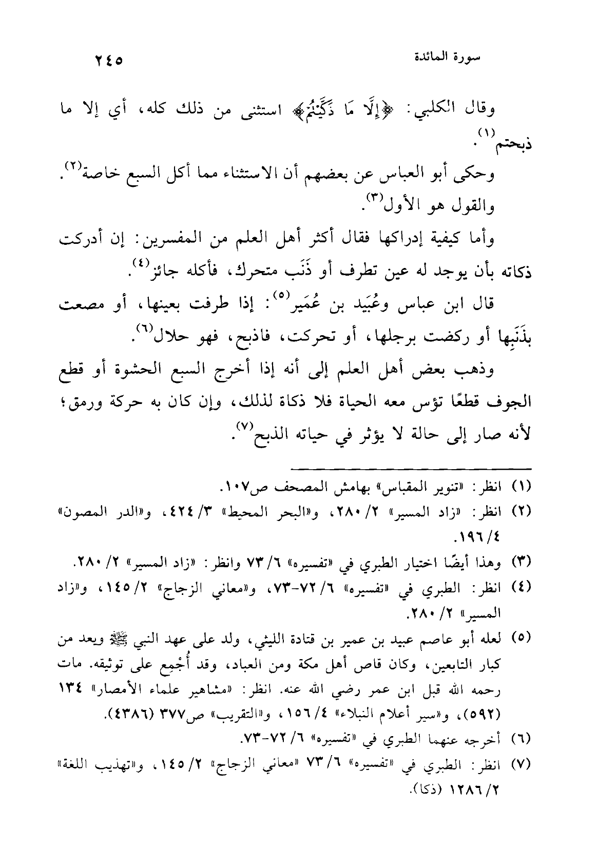 وقال ابن الأنباري: {إِلَّا مَا ذَكَّيْتُمْ} معناه: إلا ما أدركتموه وقد بقيت فيه بقيّة من الحياة حسنة تشخب معها أوداجه عند الذبح وينهر دمه، فإذا قطع السبع بطنه وأخرج حشوته بطلت التذكية؛ لأنه بعد أن يقع به هذا لا يضطرب اضطراب المذبوح ولا ينهر ولا تشخب أوداجه.