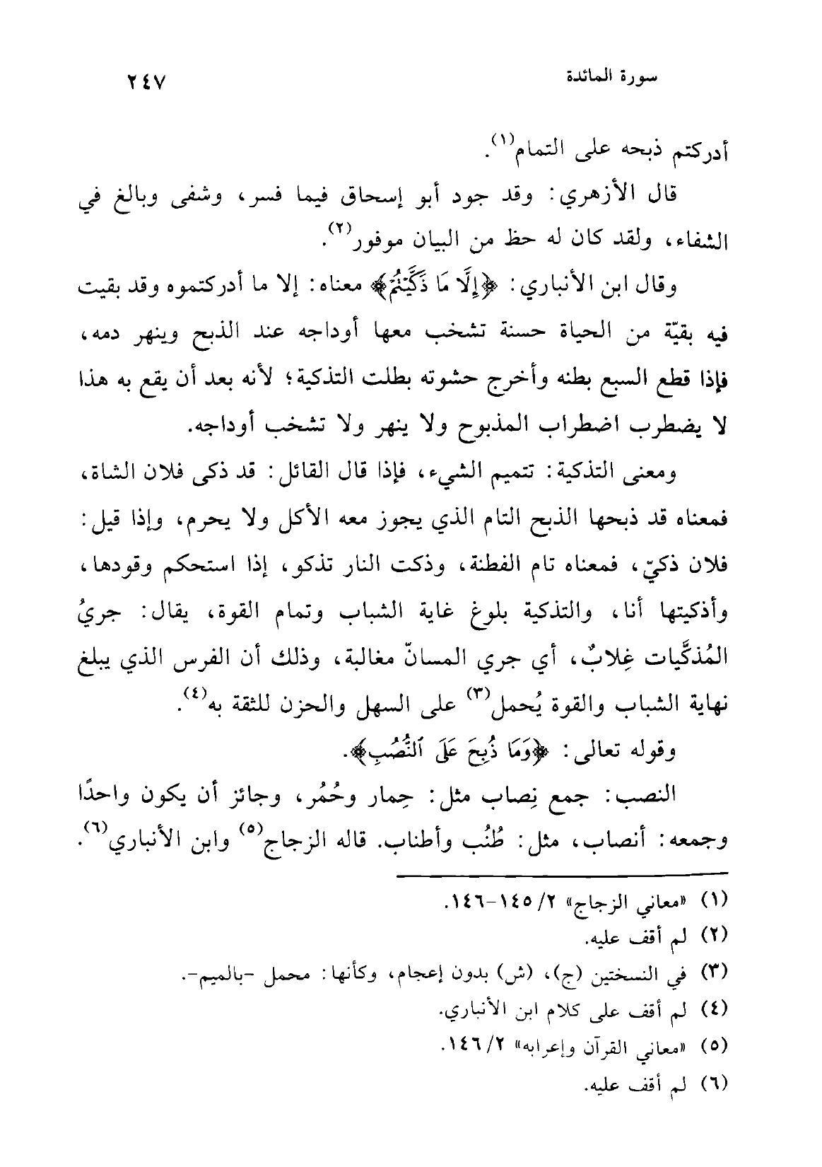 وقال قطرب: معناه {وَمَا ذُبِحَ عَلَى النُّصُبِ} (على) بمعنى اللام: وهما يتعاقبان في الكلام، قال الله تعالى: {فَسَلَامٌ لَكَ} [الواقعة: 91] أي: عليك، وقال تعالى: {وَإِنْ أَسَأْتُمْ فَلَهَا} [الإسراء: 7] أي فعليها (¬3).