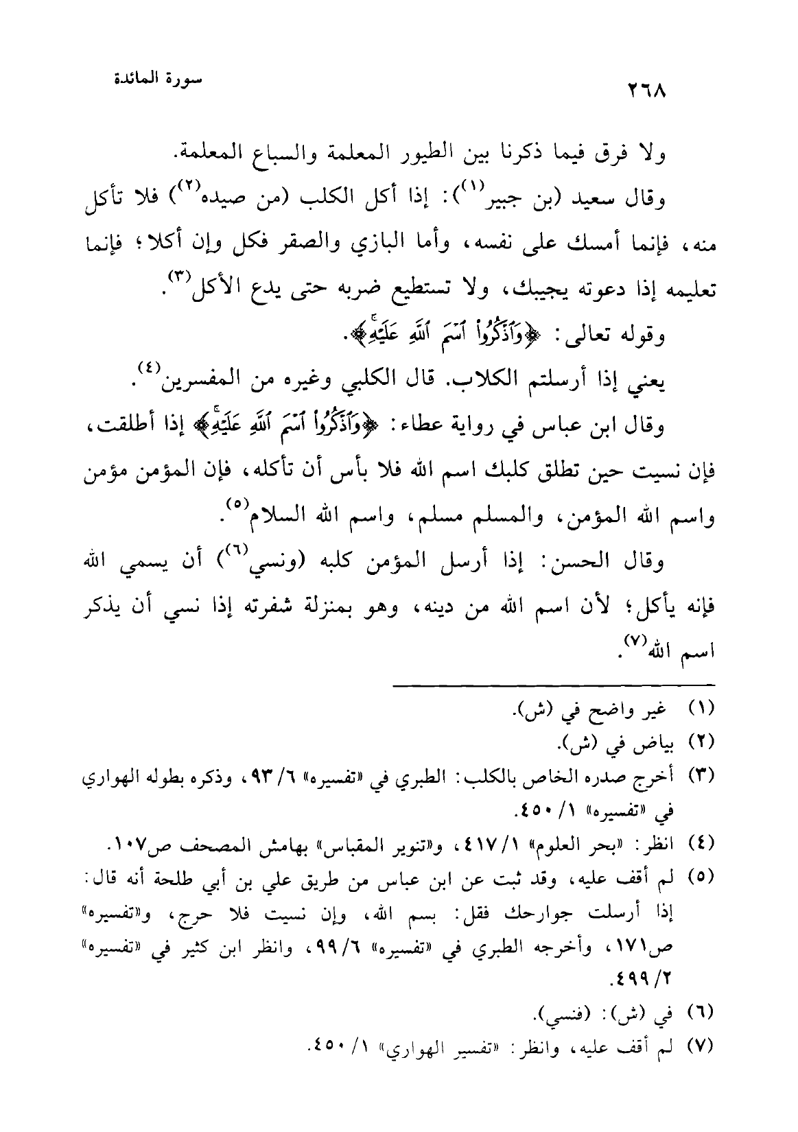 قال ابن عباس: قال الله تعالى: {وَلَا تَأْكُلُوا مِمَّا لَمْ يُذْكَرِ اسْمُ اللَّهِ عَلَيْهِ} [الأنعام: 121] ثم استثنى ذبائح أهل الكتاب فقال: {وَطَعَامُ الَّذِينَ أُوتُوا الْكِتَابَ حِلٌّ لَكُمْ} يعني: (ذبائح اليهود (¬1)) والنصارى وإن لم يذكروا اسم الله وذكروا عيسى وعزير (¬2).