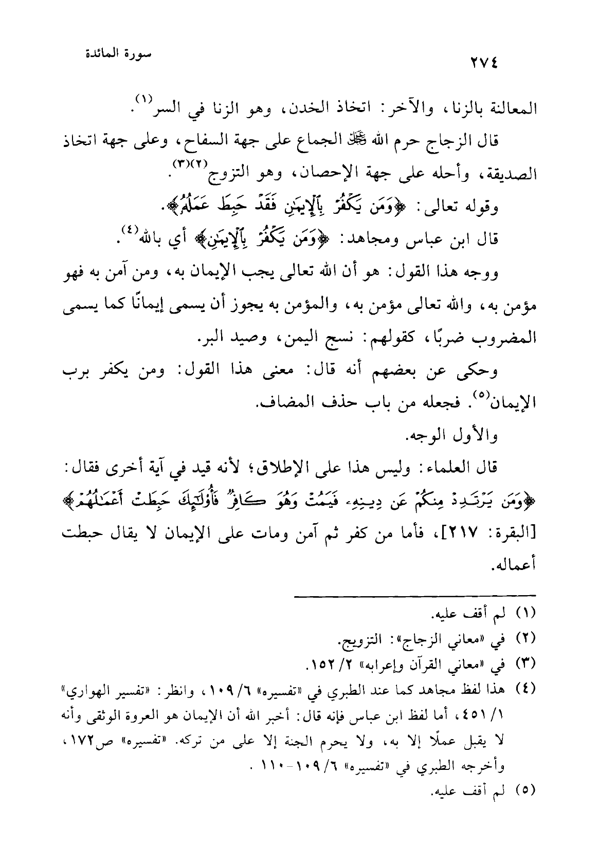 وقوله تعالى: {وَهُوَ فِي الْآخِرَةِ مِنَ الْخَاسِرِينَ} [المائدة: 5].