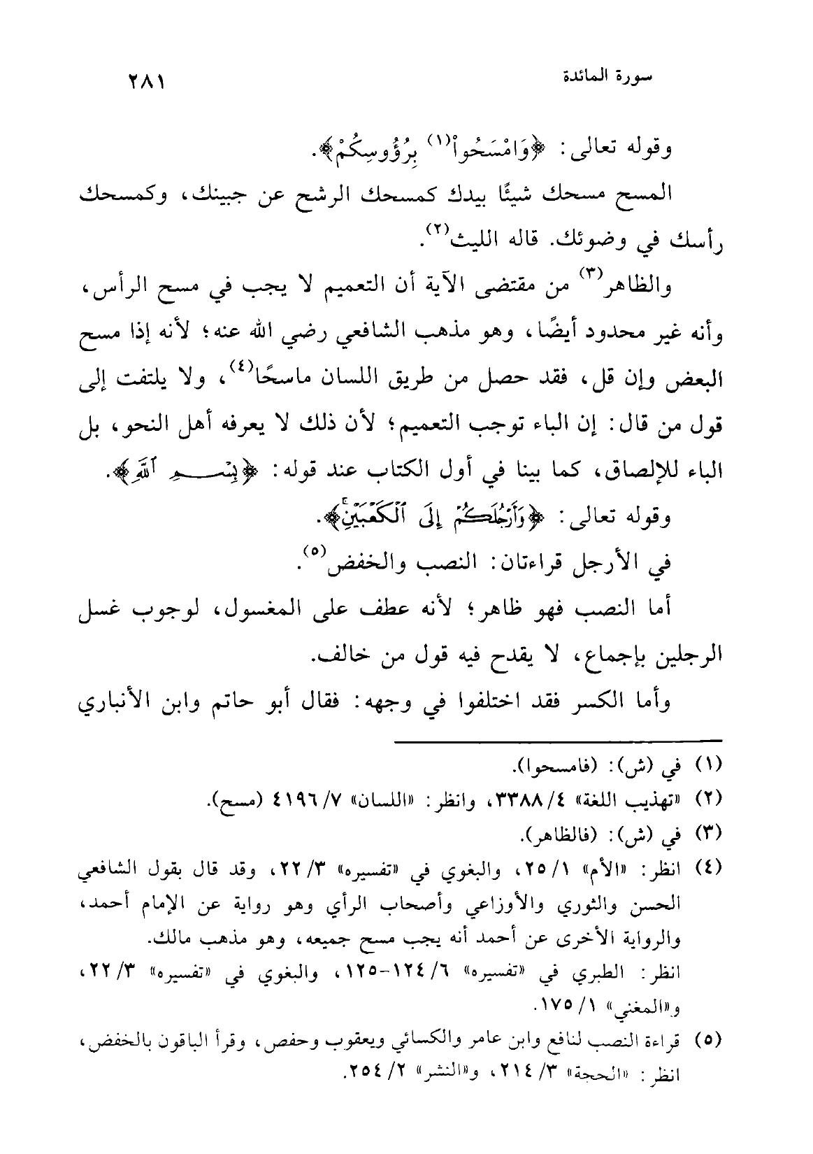 قيل: إن من قرأ بالكسر وجد في الكلام عاملين، أحدهما: الغسل والآخر الباء الجارة، ووجد العاملين إذا اجتمعا في التنزيل أن يحمل على الأقرب منهما دون الأبعد، وذلك نحو قوله تعالى: {وَأَنَّهُمْ ظَنُّوا كَمَا ظَنَنْتُمْ أَنْ لَنْ يَبْعَثَ اللَّهُ أَحَدًا} [الجن: 7]، ونحو قوله تعالى: {يَسْتَفْتُونَكَ قُلِ اللَّهُ يُفْتِيكُمْ فِي الْكَلَالَةِ} [النساء: 176]، (¬1)، ونحو قوله تعالى: {هَاؤُمُ اقْرَءُوا كِتَابِيَهْ} [الحاقة: 19]، وقوله تعالى: {آتُونِي أُفْرِغْ عَلَيْهِ قِطْرًا} [الكهف: 96]، فلما رأى العاملين إذا اجتمعا حُمِل الكلام على أقربهما إلى المعمول حمل في هذه الآية أيضاً على أقربهما وهو الباء، ولم يُخَف الالتباس لشيوع الغسل في الآثار، وقيام الدلالة على أن المراد بالمسح في الرجل الغسل (¬2). وهو ما قدمنا ذكره.