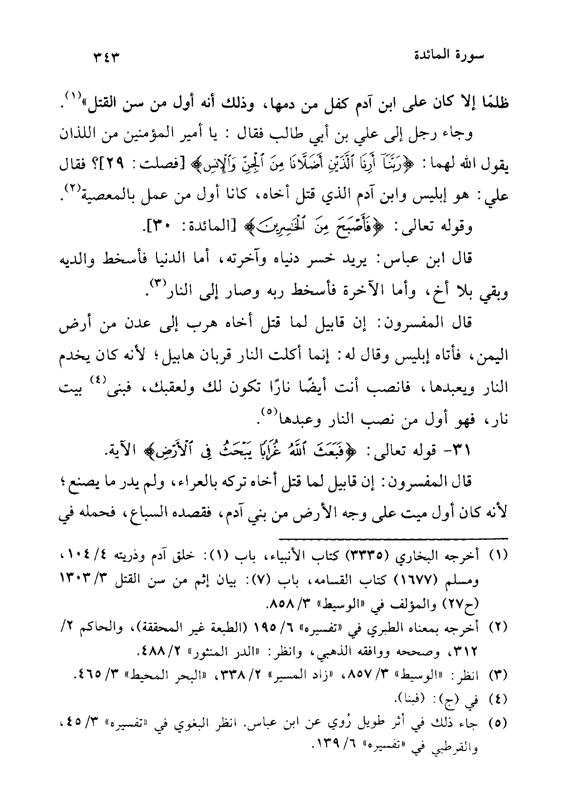 وقال آخرون: {مِنَ النَّادِمِينَ} على ذوات أخيه؛ لأنه لم ينتفع بقتل أخيه، وسخط عليه بسببه أبواه وإخوته، فندم لأجل ذلك، لا لأجل أنه جنى واقترف ذنبًا بقتله، فلم يكن ندمه على الوجه الذي يكون ندم التربة (¬4).