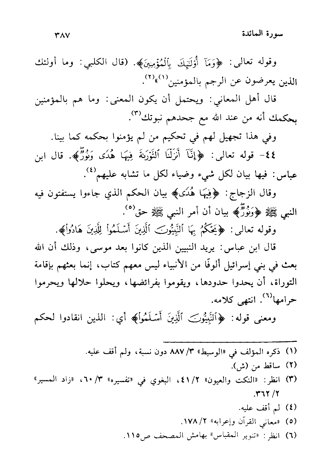 قال الزجاج: وجائز أن يكون المعنى على التقديم والتأخير، على معنى: إنا أنزلنا التوراة فيها هدى ونور للذين هادوا يحكم بها النبيون الذين أسلموا والربانيون (¬4).