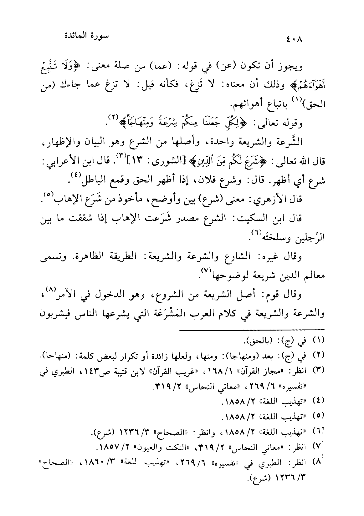قال الزجاج: الشرعة والمنهاج جميعًا: الطريق، والطريق ههنا: الدين، ولكن اللفظ إذا اختلف أتى به بألفاظ تؤكد بها القصة والأمر. قال: وقال بعضهم: الشرعة: الدين والمنهاج: الطريق (¬1).