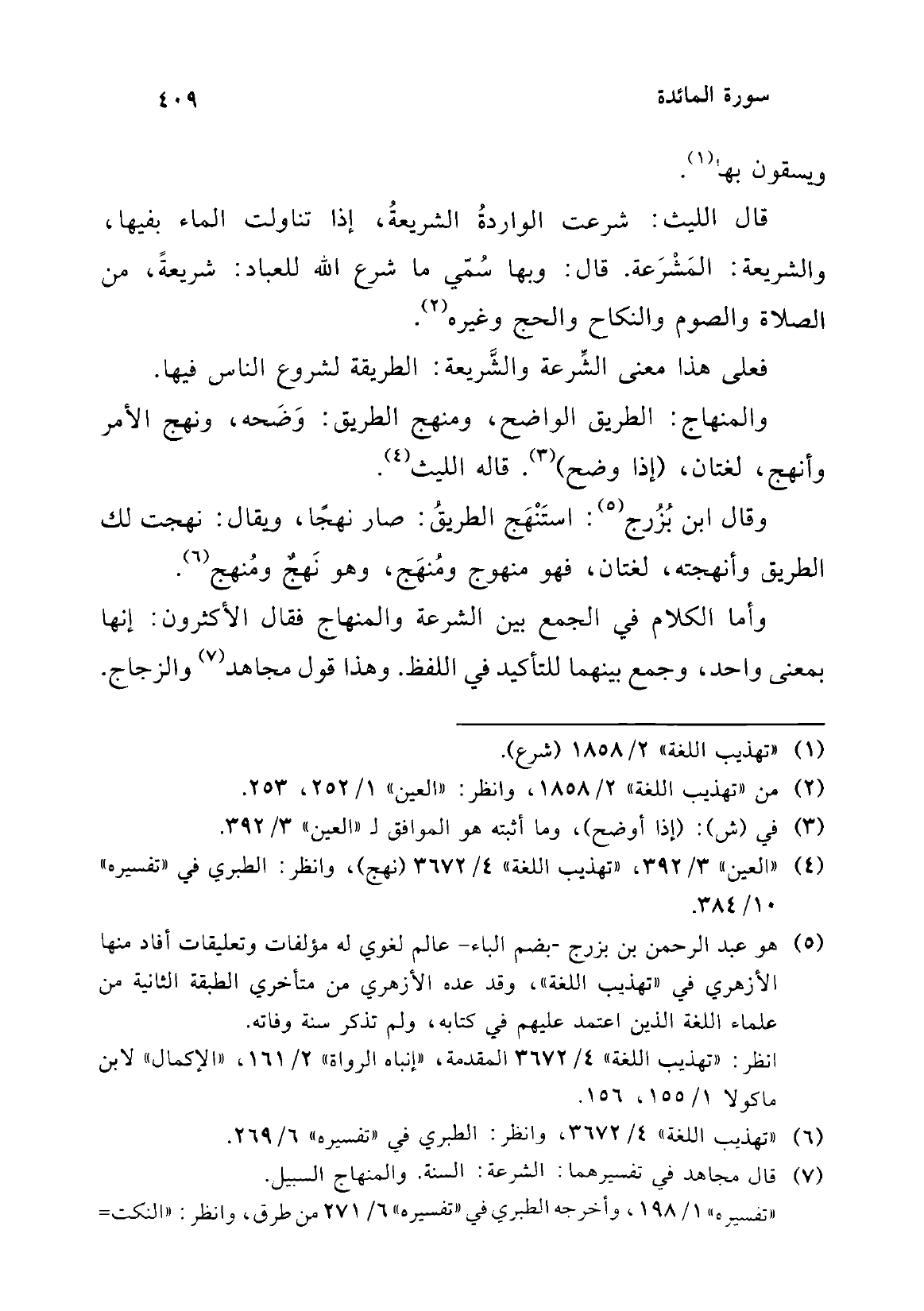 وقال مجاهد: {شِرْعَةً وَمِنْهَاجًا} السبيل الجادة (¬8)، من دخل في دين محمد فقد جعل له شرعة ومنهاجًا، والقرآن له شرعة ومنهاج (¬9).
