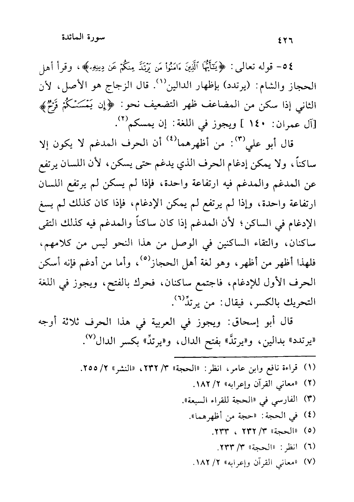 فأما التفسير فقال الحسن: علم الله تعالى أن قوماً يرجعون عن الإسلام بعد موت نبيهم - صلى الله عليه وسلم -، فأخبرهم أنه سيأتي بقوم يحبهم ويحبونه (¬1).