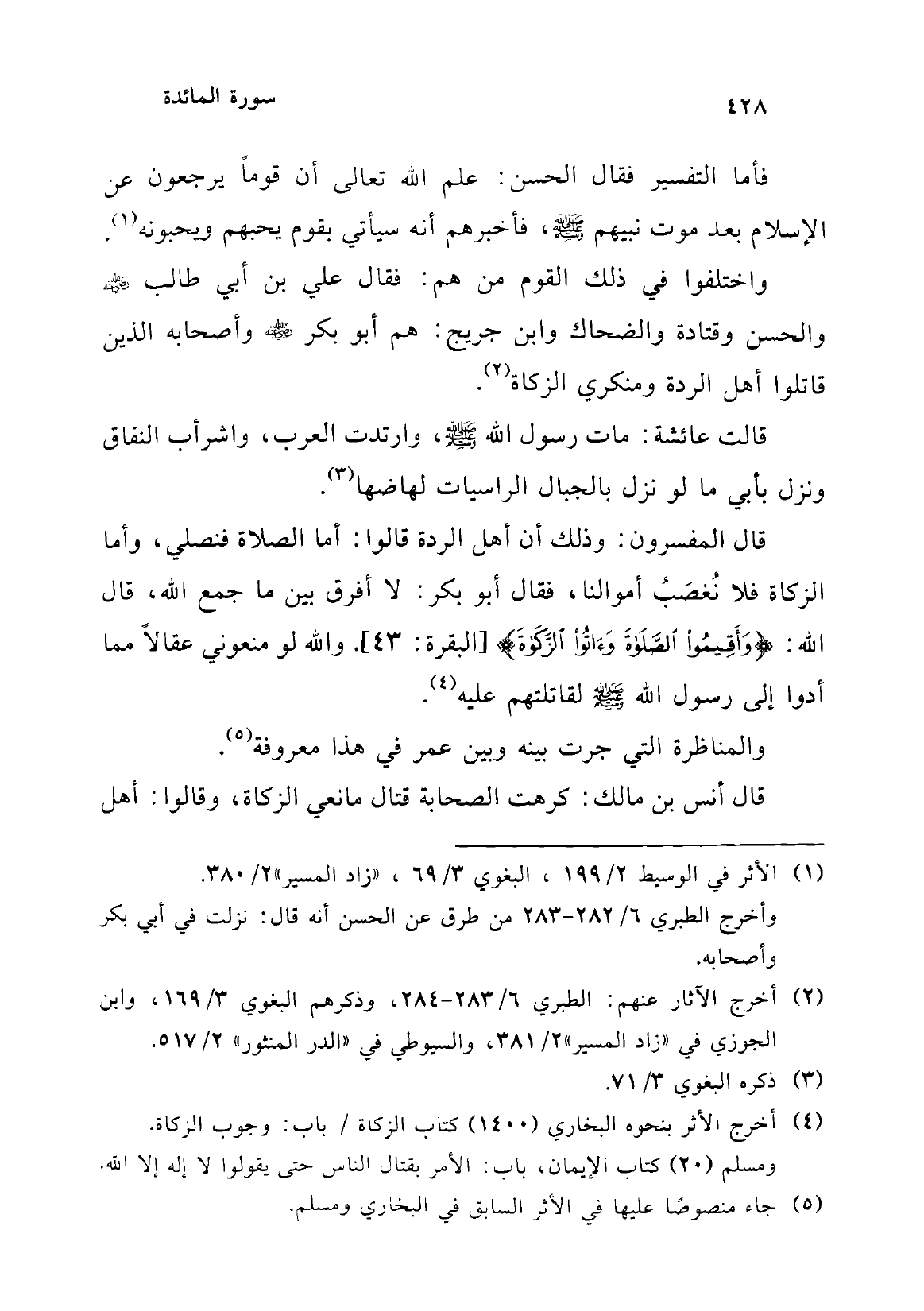 فهؤلاء قاتلوا أهل الردة بأمر أبي بكر، فحمدوا بطاعتهم له وانتهائهم إلى أمره، فليس يخرج أبو بكر عن أن يكون منهم، ثم الآية تتناول بعمومها كل من يكون منهم، ثم الآية تتناول بعمومها كل من يكون بعدهم إلى قيام الساعة، ممن يجاهد أهل الشرك والكفر والردة في سبيل الله.