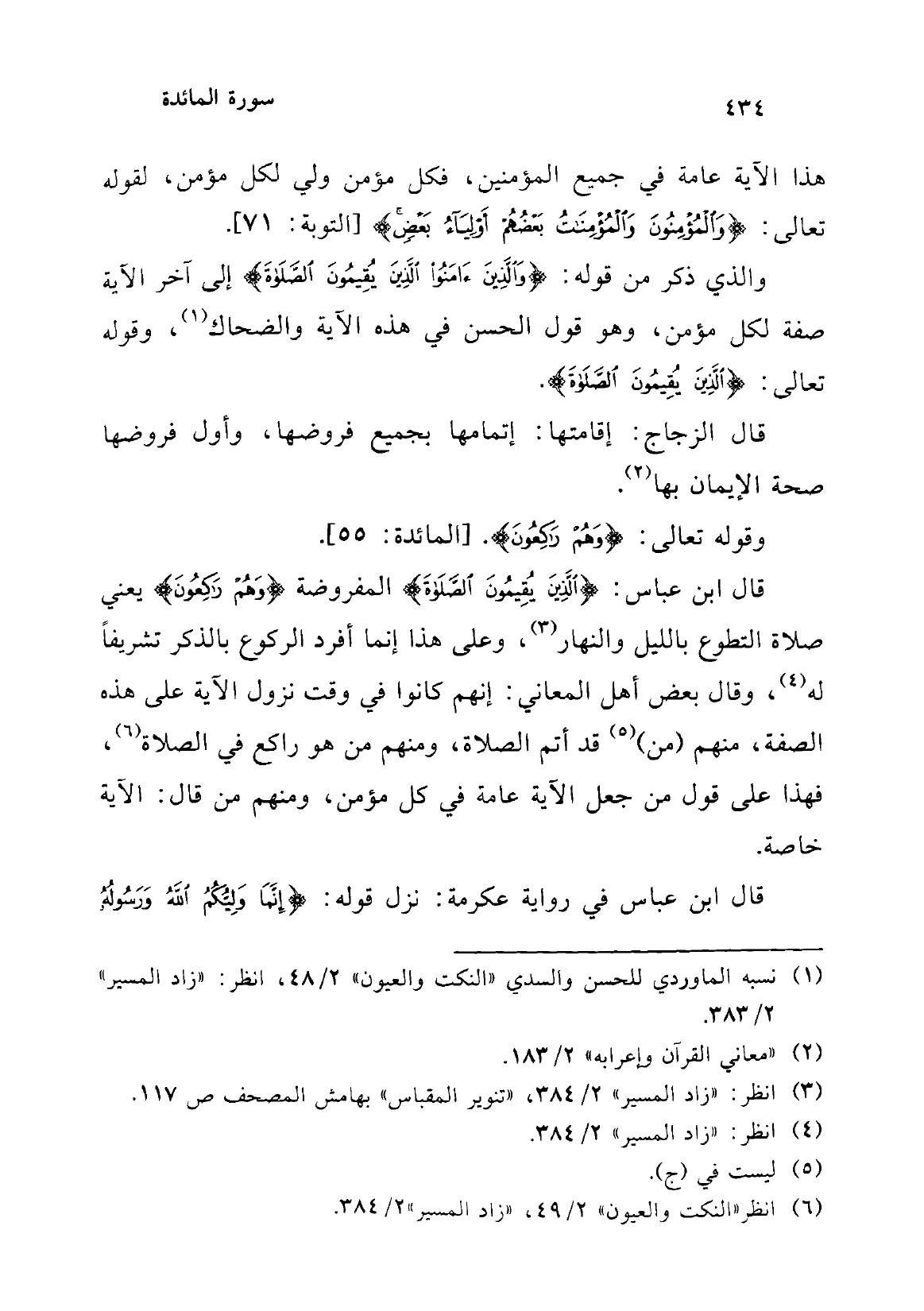 (¬4) قال ابن كثير رحمه الله: وأما قوله: {وهم راكعون} فقد توهم بعض الناس أن هذه الجملة في موضع الحال من قوله {ويؤتون الزكاة} أي في حال ركوعهم، ولو كان كذلك لكان دفع الزكاة في حال الركوع أفضل من غيره؛ لأنه ممدوح، وليس الأمر كذلك عند أحد من العلماء مما نعلمه من أئمة الفتوى ... "تفسير ابن كثير" 2/ 81.