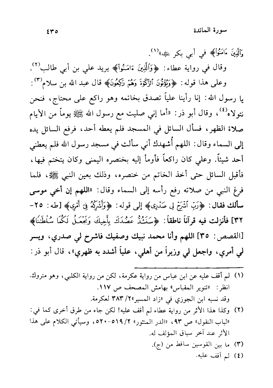 وقال المفسرون: وهذا وإن كان نزوله وافق عليًّا، فإنه عام في كل مؤمن، كما روى هشام، عن عبد الملك بن أبي سليمان، قال: سألت أبا جعفر محمد بن علي (¬1) عن قوله تعالى: {إِنَّمَا وَلِيُّكُمُ اللَّهُ وَرَسُولُهُ وَالَّذِينَ آمَنُوا} من هم؟ قال: هم المؤمنون. قلت: فإن ناساً يقولون: هو علي. قال: فعليٌّ من الذين آمنوا (¬2).