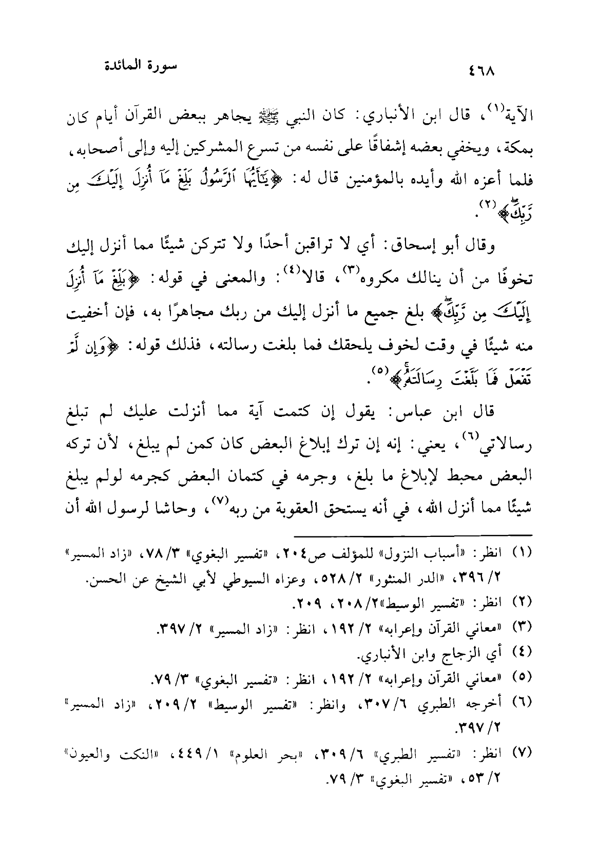 وقال الزجاج في قوله: {وَاللهُ يَعْصِمُكَ مِنَ النَّاسِ}: أي يحول بينهم وبين أن يصيبك منهم مكروه (¬5)، فإن قيل: أليس قد شج جبينه وكسرت رباعيته؟، قلنا: كان هذا قبل نزول الآية؛ لأن هذه السورة من آخر القرآن نزولا، أو نقول: المراد بالعصمة: أن يعصمه من قتله وأسره على ما ذكرنا أولاً (¬6).