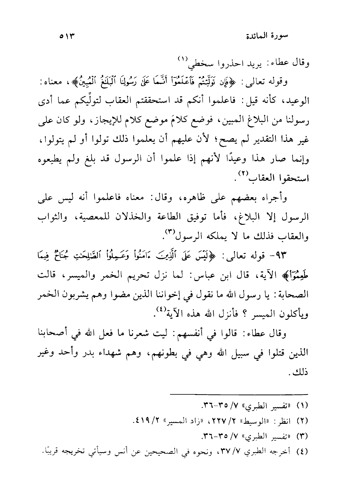 وهم يطعمونها؟ فأنزل الله تعالى: {لَيْسَ عَلَى الَّذِينَ آمَنُوا وَعَمِلُوا الصَّالِحَاتِ} من الأموات والأحياء في البلدان {جُنَاحَ} إثم فيما طعموا من الخمر والقمار {إِذَا مَا اتَّقَوْا} ما حرم الله عليهم {وَآمَنُوا} بالله {وَعَمِلُوا الصَّالِحَاتِ} في إيمانهم {ثُمَّ اتَّقَوْا} إن أحدث الله لهم تحريم شيء مما أحل لهم {وَأَحْسَنُوا} فيما تعبدهم الله به (¬1).