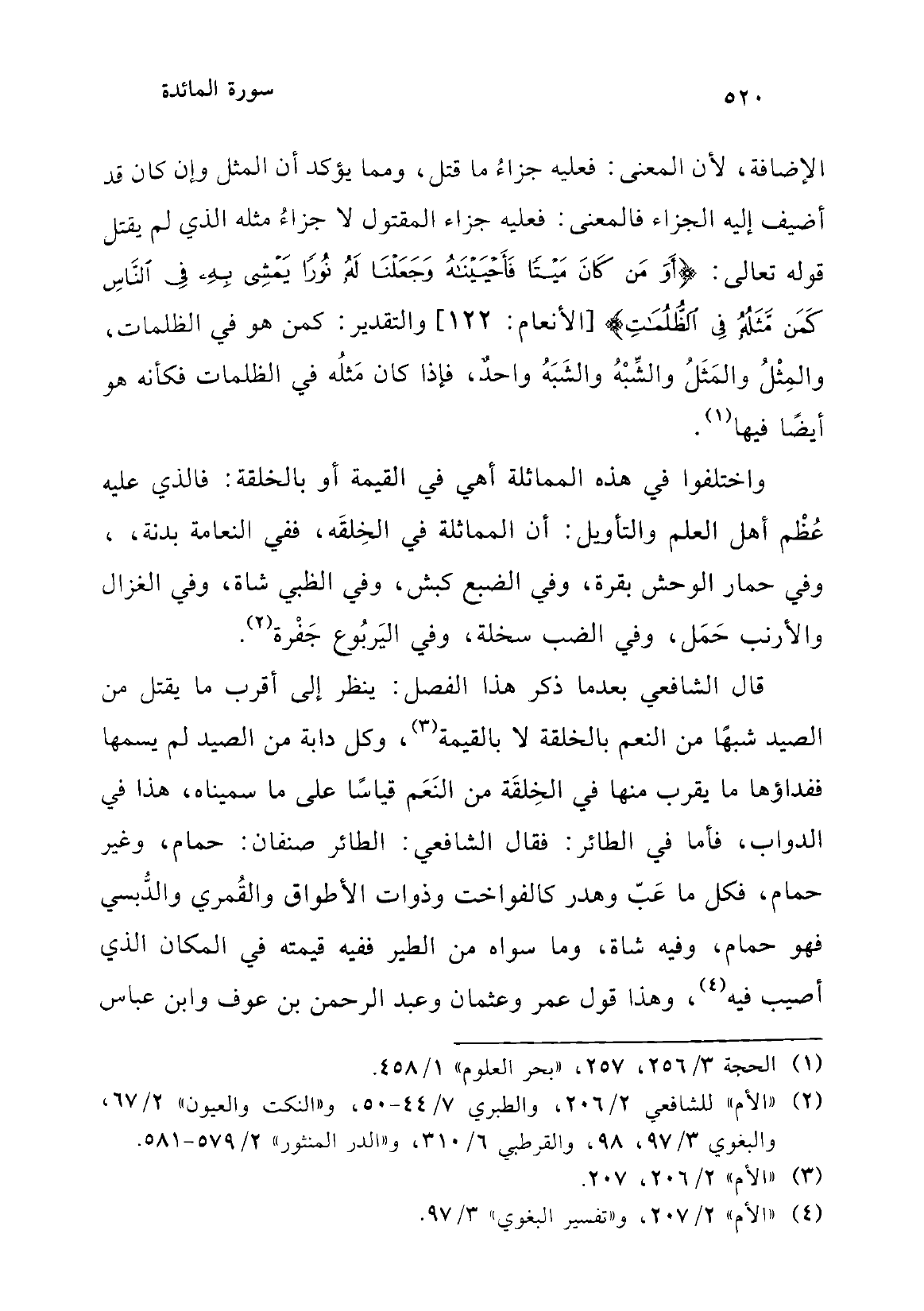 وأخبرنا الأستاذ أبو إسحاق أحمد بن إبراهيم رحمه الله، أخبرنا أبو بكر محمَّد بن أحمد بن عبدوس الحيري، أخبرنا محمد بن الحسن، أخبرنا علي بن عبد العزيز، حدثنا القاسم بن سلام، قال: حدثني ابن أبي أمية، عن أبي عوانة، عن عبد الملك بن عمير، عن قبيصة بن جابر، قال: خرجنا حُجاجًا، فكنَّا إذا صلينا الغداةَ اقتدنا رواحلنا نتماشى ونتحدث، فبينا نحن ذات غداة إذ (¬2) سنح لنا ظبي فابتدرنا، فابتدرته ورميته فأصاب خُشَّاءَه (¬3) فركب رَدْعَهُ (¬4) فمات، فلما قدمنا مكة سألنا عمر بن الخطاب، وكان حاجًا وكان جالسًا إلى جنبه عبد الرحمن بن عوف، فسألته عن ذلك، فقال عمر لعبد الرحمن: ما ترى؟ قال: عليه شاة، قال: وأنا أرى ذلك، فقال: اذهب فاذبح (¬5) شاة، فخرجت إلى صاحبي فقلت: إن أمير المؤمنين لم يدر ما يقول حتى سأل غيره، قال: فلم يفجأنا إلا عمر ومعه الدِّرة فعلاني بالدرة وقال: أتقتل في الحرم وتُسَفِّه الحكم؟ قال الله تعالى: {يَحْكُمُ بِهِ ذَوَا