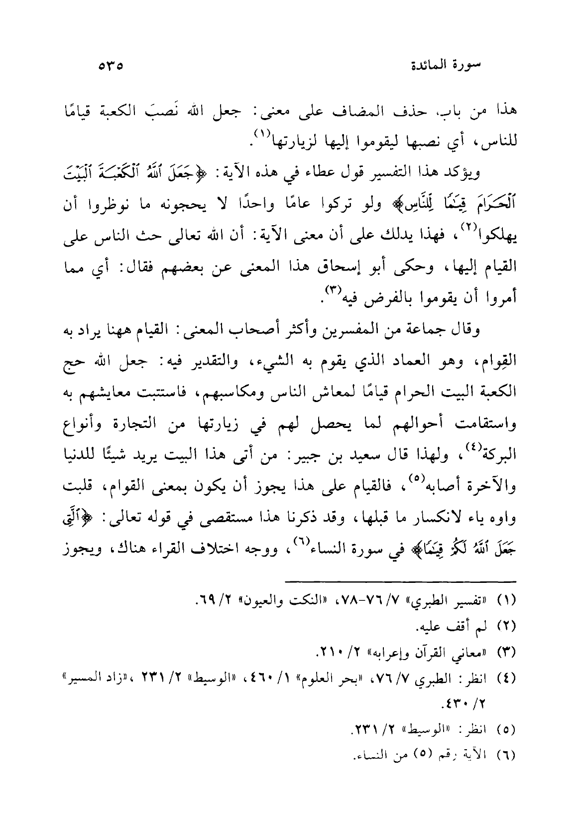 وشرح عبد الله بن مسلم (¬2)، هذا التفسير الثاني في معنى الآية، وأوضحه بأبلغ بيان، فقال: إن أهل الجاهلية كانوا يتغاورون، ويسفكون الدماء بغير حقها، ويأخذون الأموال بغير حلها، ويخيفون السبيل (¬3)، ويطلب الرجل منهم الثأر فيقتل غير قاتله، ويصيب غير الجاني عليه، ولا يبالي من كان بعد أن يراه كفؤًا لوليه، ويسميه الثأر المُنِيم، فجعل الله الكعبة البيت الحرام وما حولها من الحرم والشهر الحرام والهدي والقلائد قيامًا للناس أي أمنًا لهم، فكان الرجل إذا خاف على نفسه لجأ إلى الحرم فأمن يقول الله تعالى: {أَوَلَمْ يَرَوْا أَنَّا جَعَلْنَا حَرَمًا آمِنًا وَيُتَخَطَّفُ النَّاسُ مِنْ حَوْلِهِمْ} [العنكبوت: 67]، وإذا دخل الشهر الحرام تقسمتهم الرِّحَل وتوزعتهم النُّجَعُ وانبسطوا في متاجرهم فأمنوا على أموالهم وأنفسهم. وإذا أهدى الرجل هديًا أو قلد بعيره من لحاء شجر الحرم أمن كيف تَصَرَّف (¬4) وحيث سلك، ولو تُرِكَ الناس على جاهليتهم وتغاورهم في كل موضع وكل شهر لفسدت الأرض، وفَنِيَ الناس، وتقطعت السبل، وبطلت المتاجر (¬5)، ونحو هذا قال أبو بكر بن الأنباري، فقد حصل في الآية
