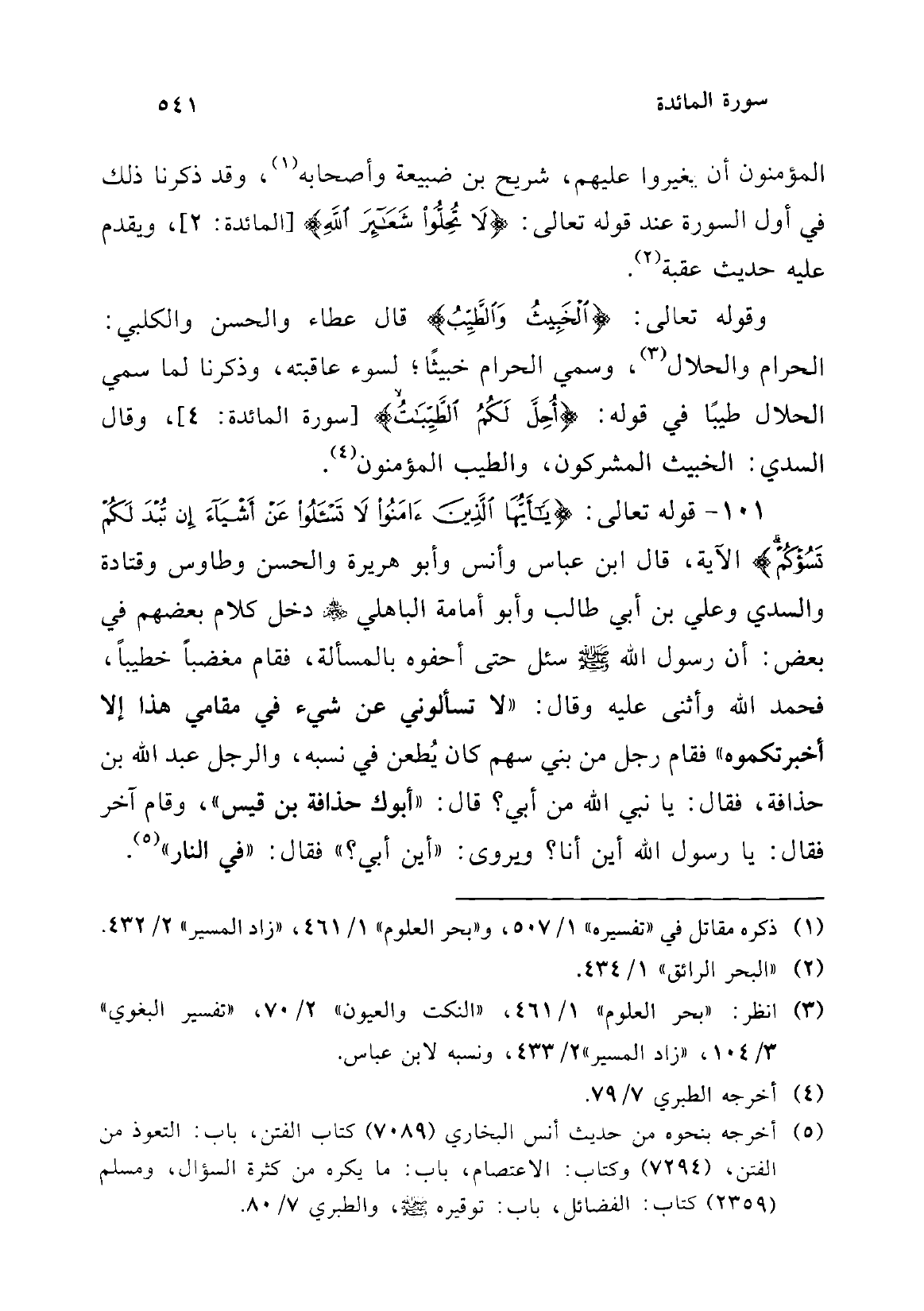 قالوا: وقوله تعالى: {عَفَا اللَّهُ عَنْهَا} مؤخر في النظم مقدم في المعنى؛ لأن التقدير: لا تسألوا عن أشياء إن تبد لكم تسؤكم عفا الله عنها، وإن شئت قلت: لا تسألوا عن أشياء عفا الله عنها إن تبد لكم تسؤكم (¬2)، فقوله: {إِنْ تُبْدَ لَكُمْ تَسُؤْكُمْ} وقوله: {عَفَا اللَّهُ عَنْهَا} جملتان صفتان لأشياء، وهي نكرة، ومعنى: {عَفَا اللَّهُ عَنْهَا} أي كف وأمسك عن ذكرها فلم يوجب فيها حكماً، وكلام أبي إسحاق دل على هذه الجملة التي ذكرنا، لأنه قال: أعلم الله عز وجل أن السؤال عن مثل هذا الجنس لا ينبغي أن يقع، فإنه إذا ظهر فيه الجواب ساء ذلك، ولا إن ظهر وجه في المسألة عما عفا الله عنه، وفيه إن ظهر فضيحةٌ على السائل (¬3).