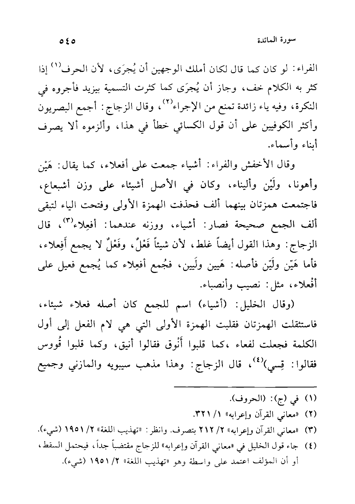 ويمكن أن يقال: إن أشياء لفظ وضع للجمع لا على بناء الواحد، وأما الكسائي فإنه يقول: أشياء أفعال، ولكنها لما جمعت أشياوات أشبه فعلاء التي تجمع على فعلاوات نحو: صحراء وصحراوات، ونظير أشياء في أنها أفعال أحياء في جمع حي، كذلك أشياء أفعال في جمع شيء، والعلة المانعة لصرفها شبهها بفعلاء من حيث جمعت جمعها، ويلزم على هذا القول ترك صرف أبناء وأسماء, لأنهم قالوا في جمعها: أسماوات وأبناوات، وذهب الفراء في هذا الحرف مذهب الأخفش غير أنه خلط حين ادعى أنها (كهَيّن ولَيّن) (¬1) حين جمعا أهوناء وأليناء (¬2)، وهَيْن تخفيف هَيِّن، فلذلك جاز جمعه على أفعلاء، وشيء ليس بتخفيف عن شيِّءٍ حتى يجمع على أفعلاء، وإنما زدت في البيان عن هذا الحرف؛ لأن علمه من غامض النحو ومشكله.