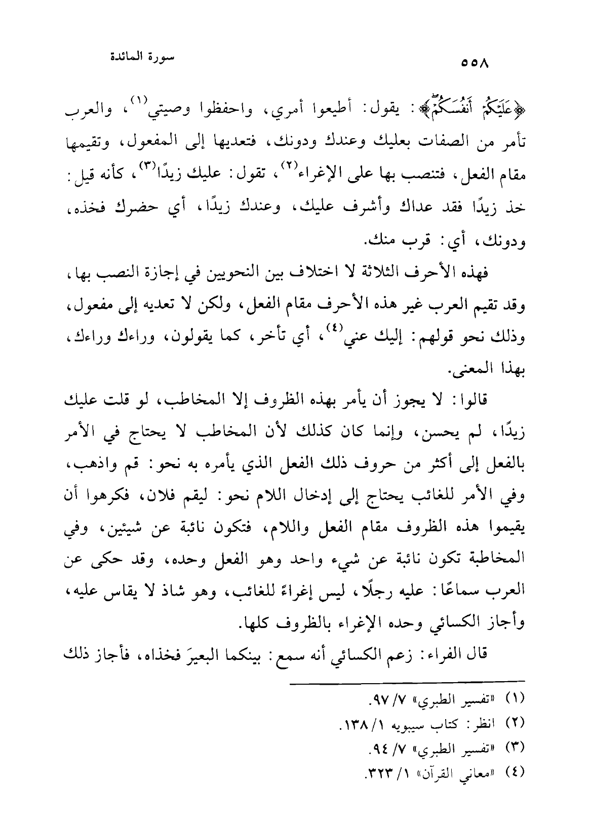 (¬2) "تفسير الطبري" 7/ 99، "معاني القرآن وإعرابه" للنحاس 2/ 373، و"بحر العلوم" 1/ 463.