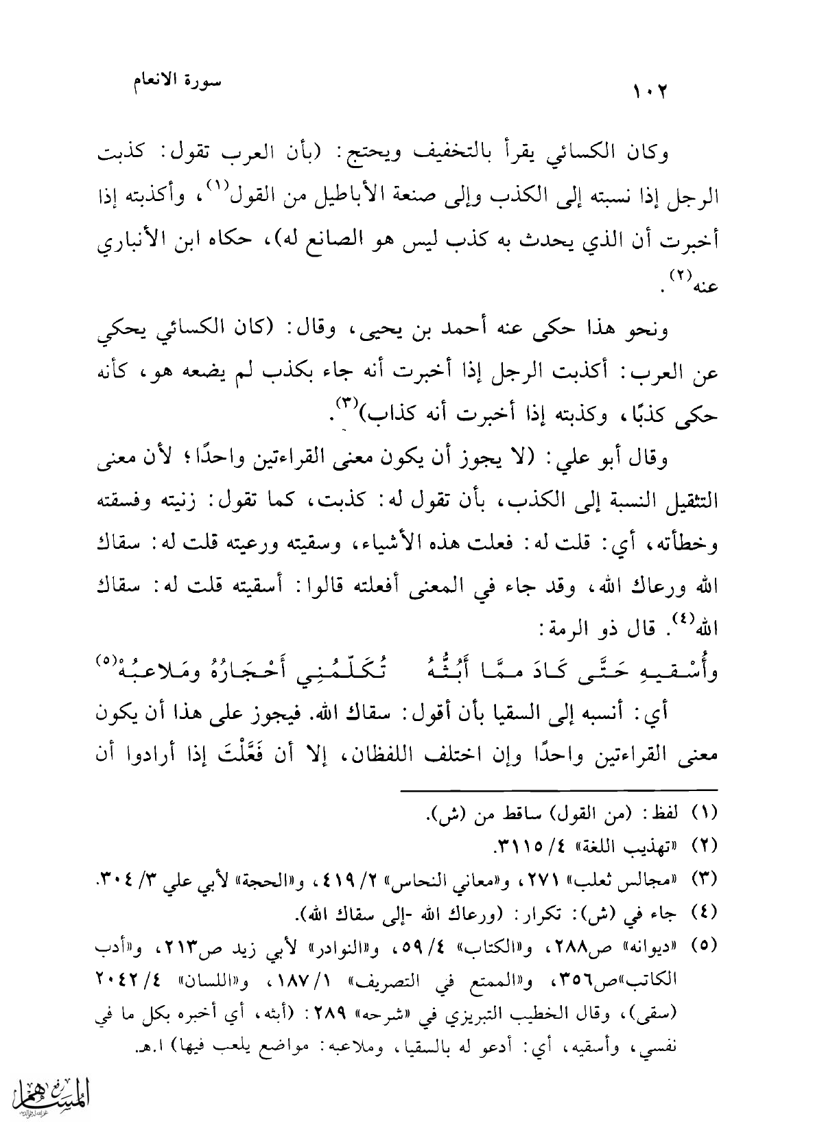 وقال أبو علي: (لا يجوز أن يكون معنى القراءتين واحداً؛ لأن معنى التثقيل النسبة إلى الكذب، بأن تقول له: كذبت، كما تقول: زنيته وفسقته وخطأته، أي: قلت له: فعلت هذه الأشياء، وسقيته ورعيته قلت له: سقاك الله ورعاك الله، وقد جاء في المعنى أفعلته قالوا: أسقيته قلت له: سقاك الله (¬4). قال ذو الرمة: