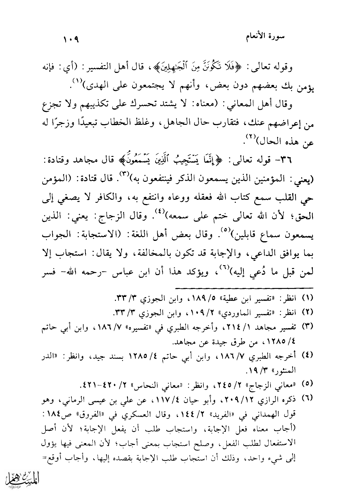 36 - قوله تعالى: {إِنَّمَا يَسْتَجِيبُ الَّذِينَ يَسْمَعُونَ} قال مجاهد وقتادة: (يعني: المؤمنين الذين يسمعون الذكر فينتفعون به) (¬3). قال قتادة: (المؤمن حي القلب سمع كتاب الله فعقله ووعاه وانتفع به، والكافر لا يصغي إلى الحق؛ لأن الله تعالى ختم على سمعه) (¬4). وقال الزجاج: يعني: الذين يسمعون سماع قابلين) (¬5). وقال بعض أهل اللغة: (الاستجابة: الجواب بما يوافق الداعي، والإجابة قد تكون بالمخالفة، ولا يقال: استجاب إلا لمن قبل ما دُعي إليه) (¬6)، ويؤكد هذا أن ابن عباس -رحمه الله- فسر