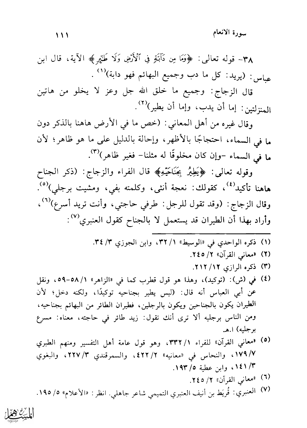 38 - قوله تعالى: {وَمَا مِنْ دَابَّةٍ فِي الْأَرْضِ وَلَا طَائِرٍ} الآية، قال ابن عباس: (يريد: كل ما دب وجميع البهائم فهو دابة) (¬1).