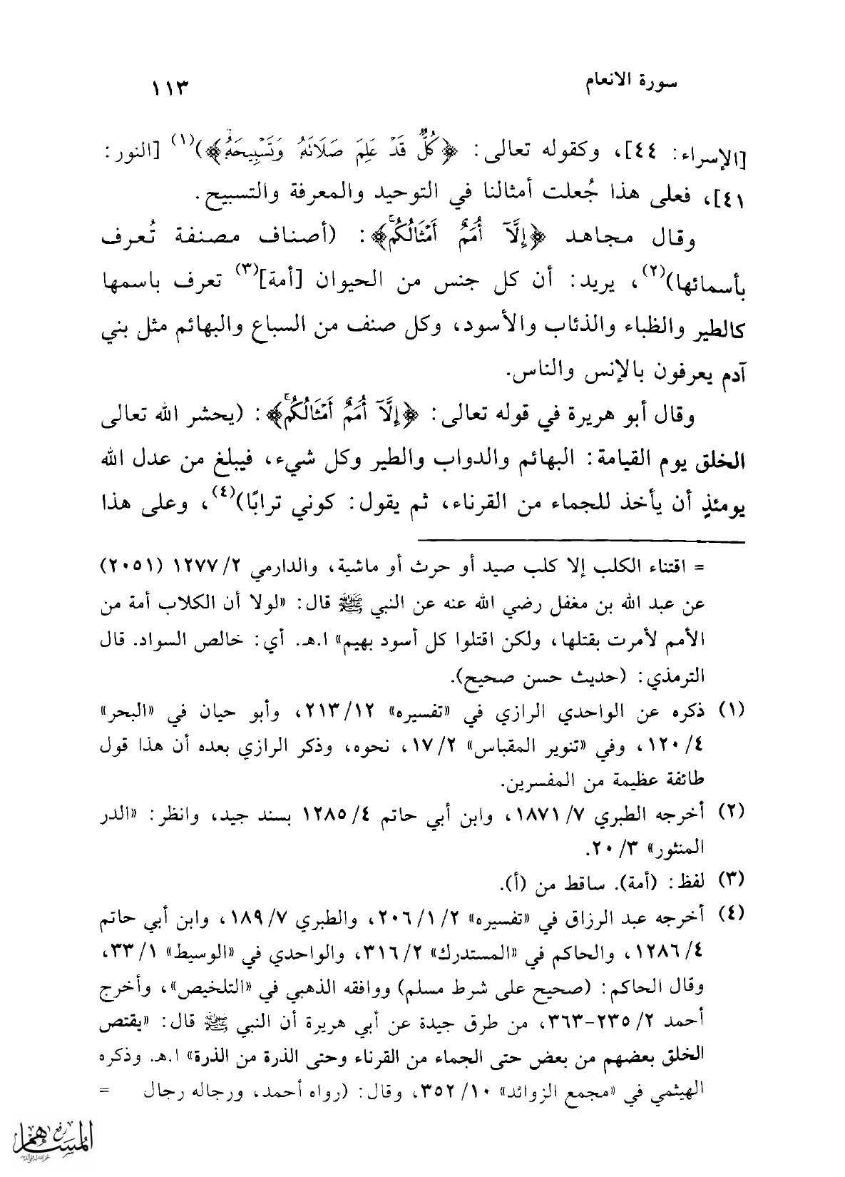 وقال أبو هريرة في قوله تعالى: {إِلَّا أُمَمٌ أَمْثَالُكُمْ}: (يحشر الله تعالى الخلق يوم القيامة: البهائم والدواب والطير وكل شيء، فيبلغ من عدل الله يومئذٍ أن يأخذ للجماء من القرناء، ثم يقول: كوني ترابًا) (¬4)، وعلى هذا