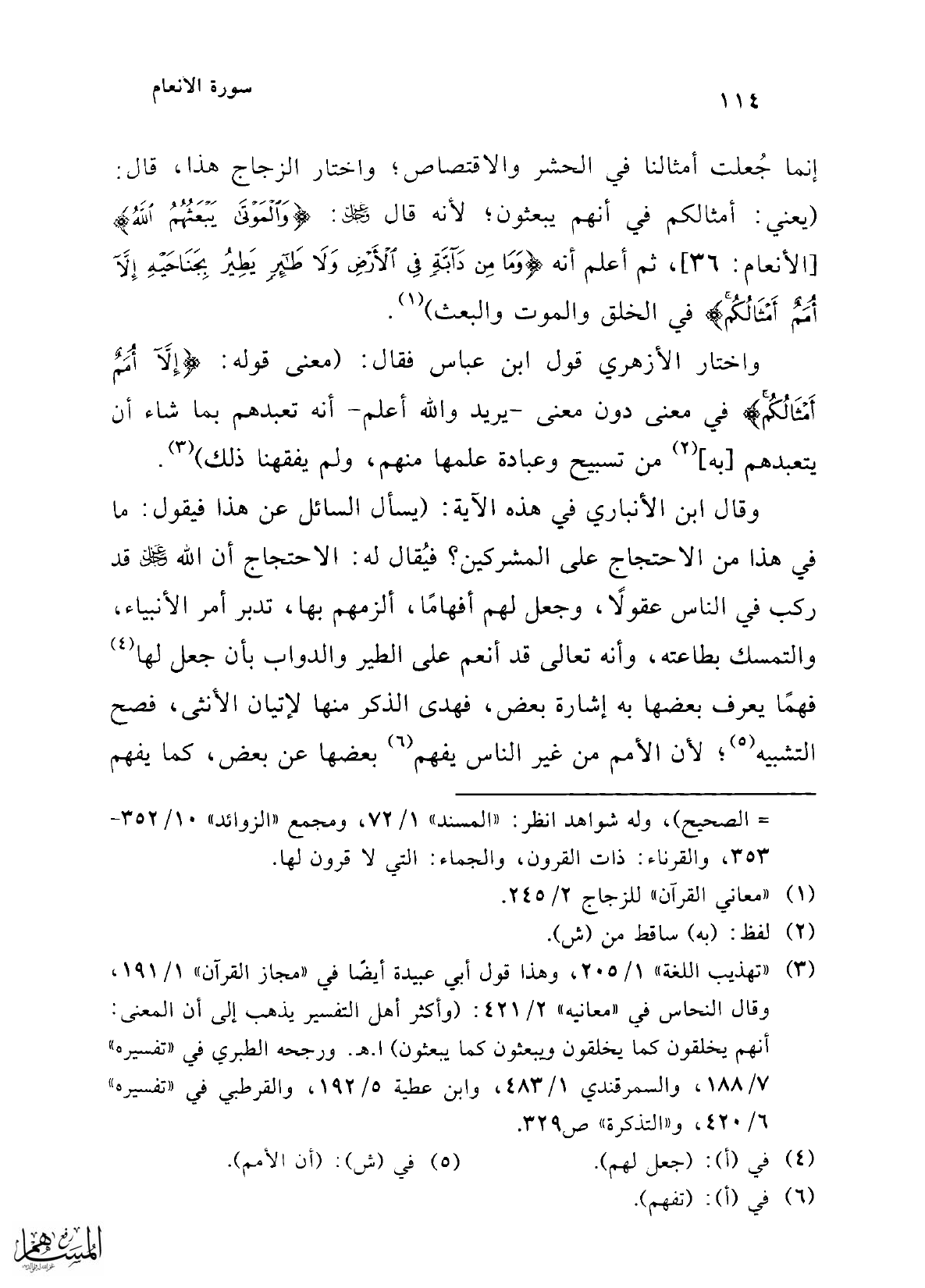 واختار الأزهري قول ابن عباس فقال: (معنى قوله: {إِلَّا أُمَمٌ أَمْثَالُكُمْ} في معنى دون معنى -يريد والله أعلم- أنه تعبدهم بما شاء أن يتعبدهم [به] (¬2) من تسبيح وعبادة علمها منهم، ولم يفقهنا ذلك) (¬3).