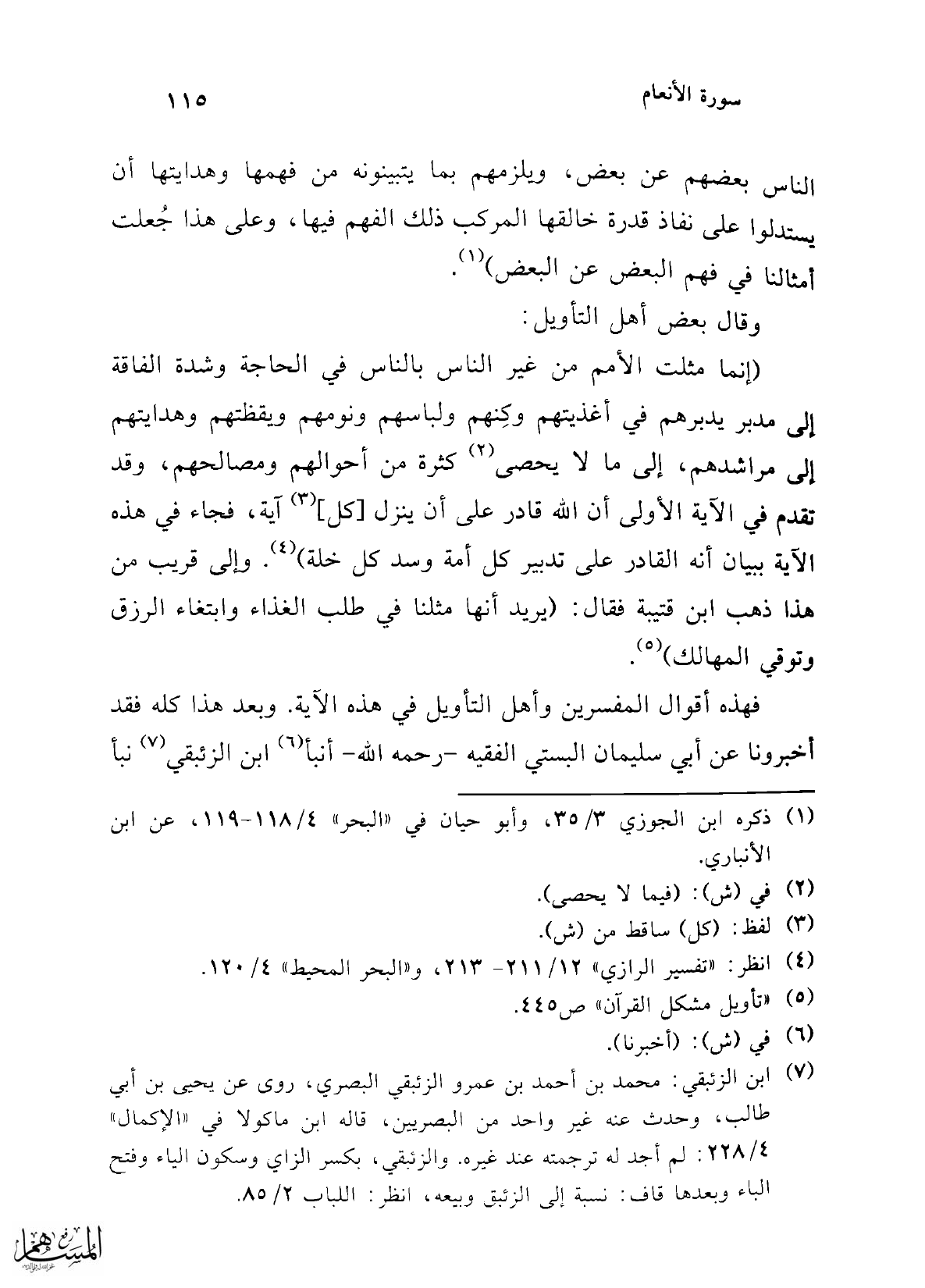 (إنما مثلت الأمم من غير الناس بالناس في الحاجة وشدة الفاقة إلى مدبر يدبرهم في أغذيتهم وكِنهم ولباسهم ونومهم ويقظتهم وهدايتهم إلى مراشدهم، إلى ما لا يحصى (¬2) كثرة من أحوالهم ومصالحهم، وقد تقدم في الآية الأولى أن الله قادر على أن ينزل [كل] (¬3) آية، فجاء في هذه الآية ببيان أنه القادر على تدبير كل أمة وسد كل خلة) (¬4). وإلى قريب من هذا ذهب ابن قتيبة فقال: (يريد أنها مثلنا في طلب الغذاء وابتغاء الرزق وتوقي المهالك) (¬5).