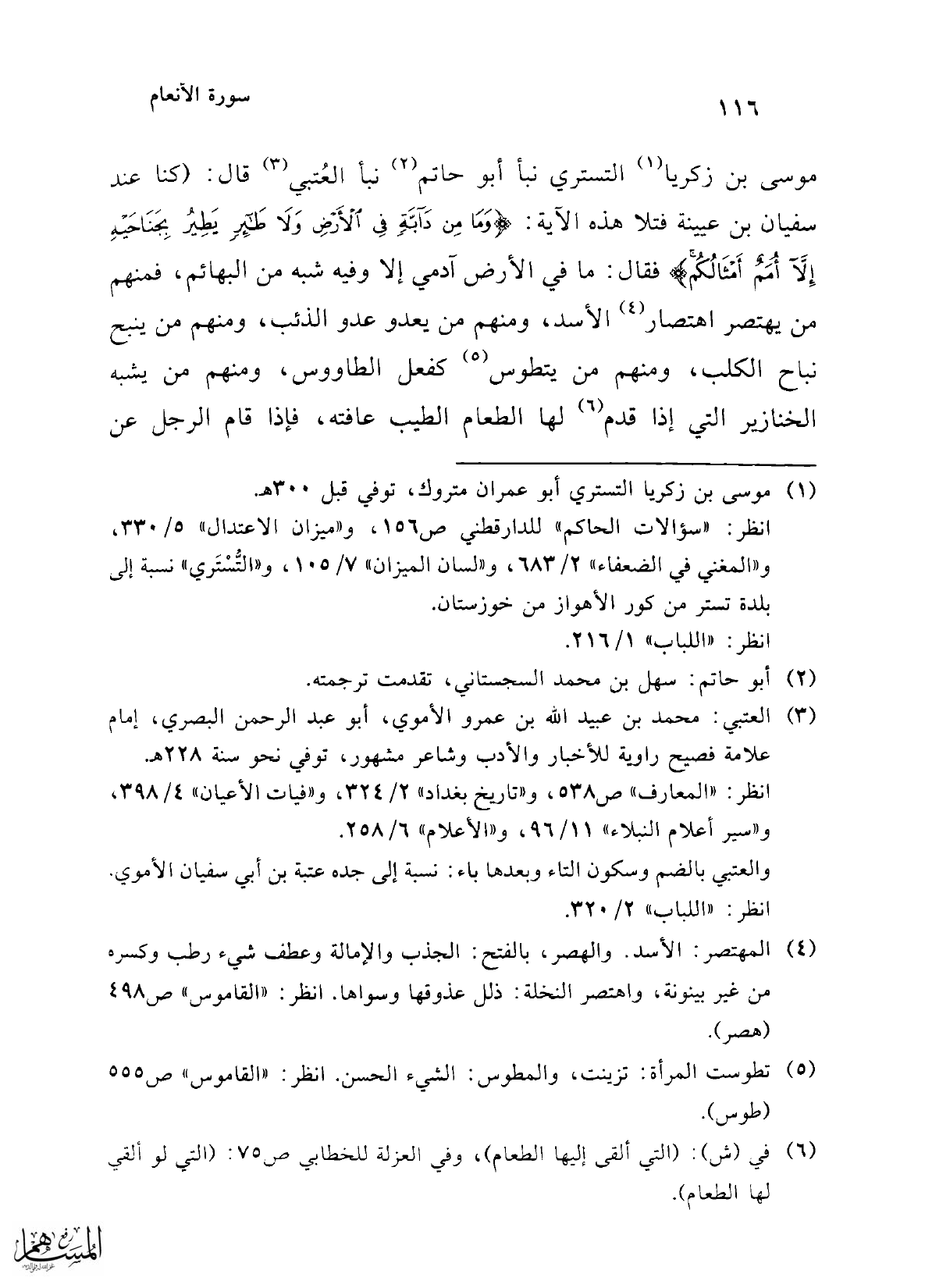 موسى بن زكريا (¬1) التستري نبأ أبو حاتم (¬2) نبأ العُتبي (¬3) قال: (كنا عند سفيان بن عيينة فتلا هذه الآية: {وَمَا مِنْ دَابَّةٍ فِي الْأَرْضِ وَلَا طَائِرٍ يَطِيرُ بِجَنَاحَيْهِ إِلَّا أُمَمٌ أَمْثَالُكُمْ} فقال: ما في الأرض آدمي إلا وفيه شبه من البهائم، فمنهم من يهتصر اهتصار (¬4) الأسد، ومنهم من يعدو عدو الذئب، ومنهم من ينبح نباح الكلب، ومنهم من يتطوس (¬5) كفعل الطاووس، ومنهم من يشبه الخنازير التي إذا قدم (¬6) لها الطعام الطيب عافته، فإذا قام الرجل عن