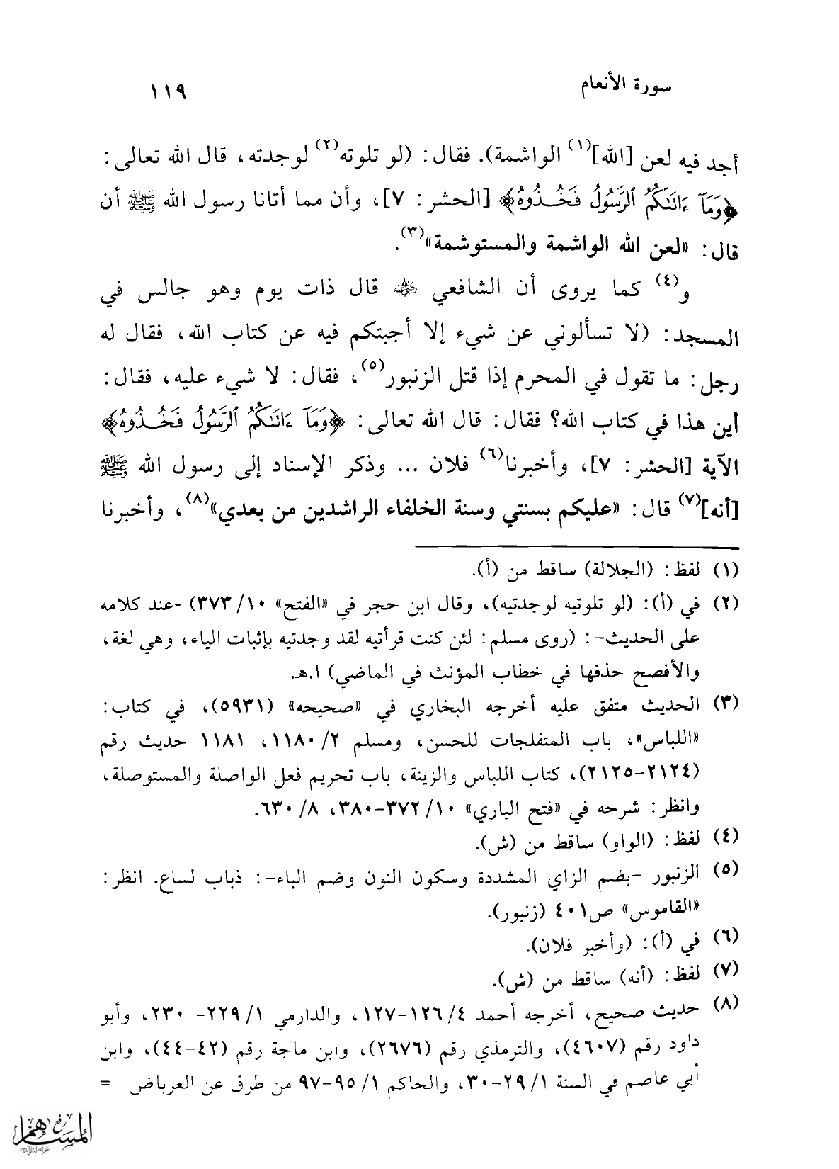 أجد فيه لعن [لله] (¬1) الواشمة). فقال: (لو تلوته (¬2) لوجدته، قال الله تعالى: {وَمَا آتَاكُمُ الرَّسُولُ فَخُذُوهُ} [الحشر: 7]، وأن مما أتانا رسول الله - صلى الله عليه وسلم - أن قال: "لعن الله الواشمة والمستوشمة" (¬3).
