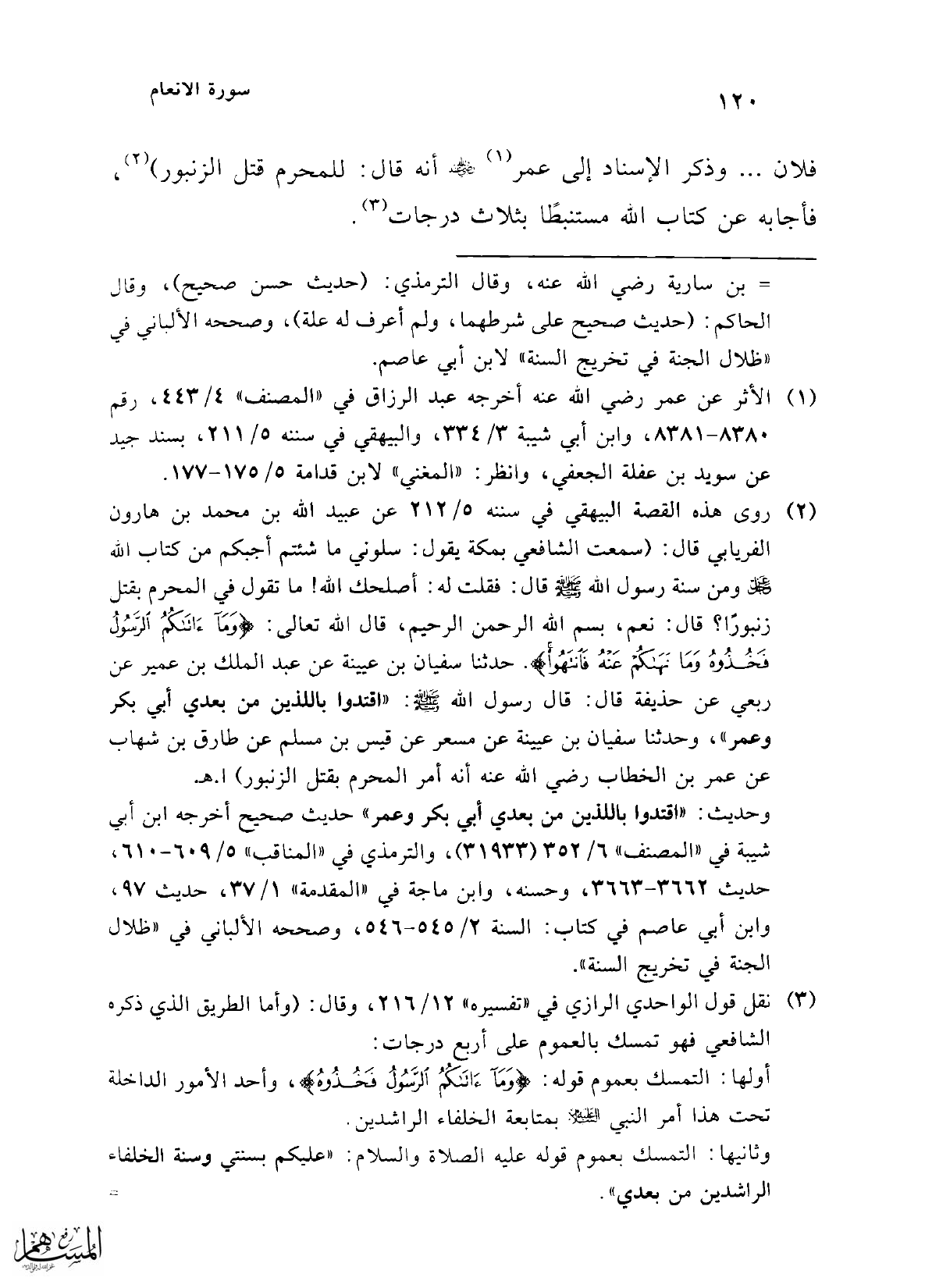 (¬2) روى هذه القصة البيهقي في سننه 5/ 212 عن عبيد الله بن محمد بن هارون الفريابي قال: (سمعت الشافعي بمكة يقول: سلوني ما شئتم أجبكم من كتاب الله عز وجل ومن سنة رسول الله - صلى الله عليه وسلم - قال: فقلت له: أصلحك الله! ما تقول في المحرم بقتل زنبورًا؟ قال: نعم، بسم الله الرحمن الرحيم، قال الله تعالى: {وَمَا آتَاكُمُ الرَّسُولُ فَخُذُوهُ وَمَا نَهَاكُمْ عَنْهُ فَانْتَهُوا}. حدثنا سفيان بن عيينة عن عبد الملك بن عمير عن ربعي عن حذيفة قال: قال رسول الله - صلى الله عليه وسلم -: "اقتدوا باللذين من بعدي أبي بكر وعمر"، وحدثنا سفيان بن عيينة عن مسعر عن قيس بن مسلم عن طارق بن شهاب عن عمر بن الخطاب رضي الله عنه أنه أمر المحرم بقتل الزنبور) ا. هـ.