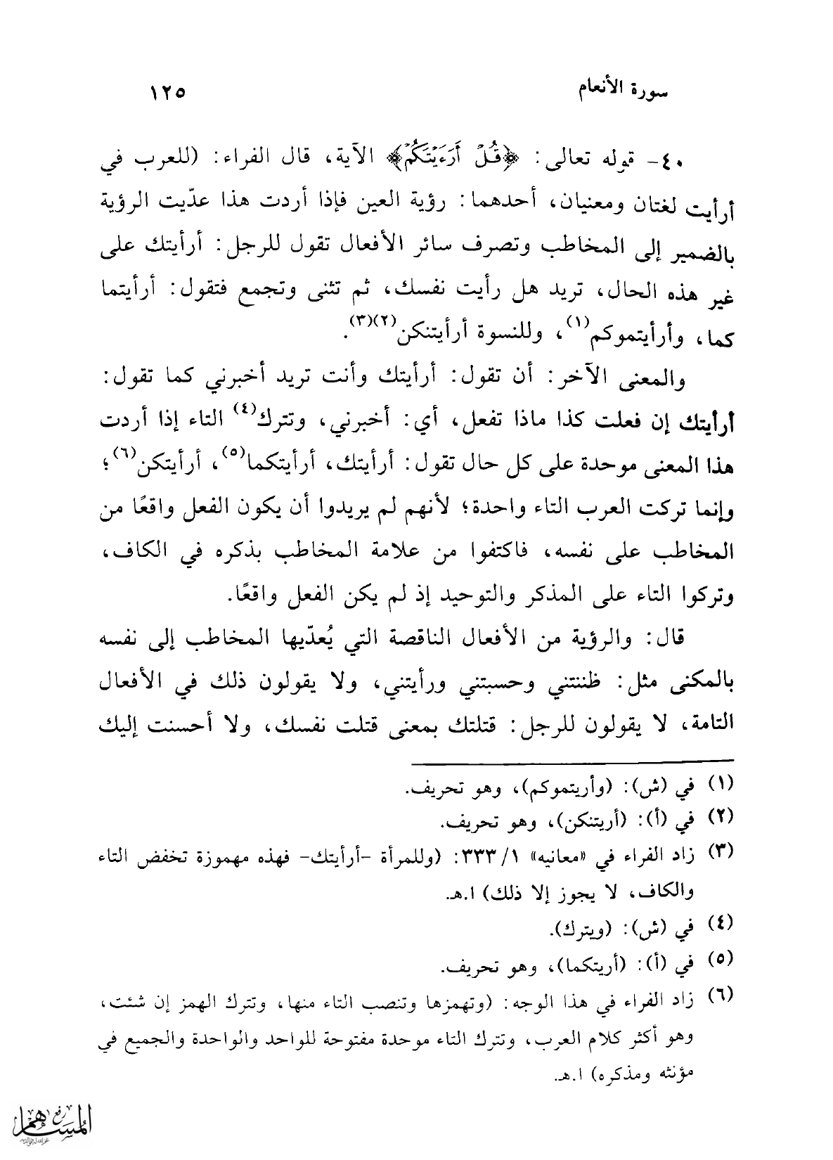 40 - قوله تعالى: {قُلْ أَرَأَيْتَكُمْ} الآية، قال الفراء: (للعرب في أرأيت لغتان ومعنيان، أحدهما: رؤية العين فإذا أردت هذا عدّيت الرؤية بالضمير إلى المخاطب وتصرف سائر الأفعال تقول للرجل: أرأيتك على غير هذه الحال , تريد هل رأيت نفسك، ثم تثنى وتجمع فتقول: أرأيتما كما، وأرأيتموكم (¬1)، وللنسوة أرأيتنكن (¬2) (¬3).