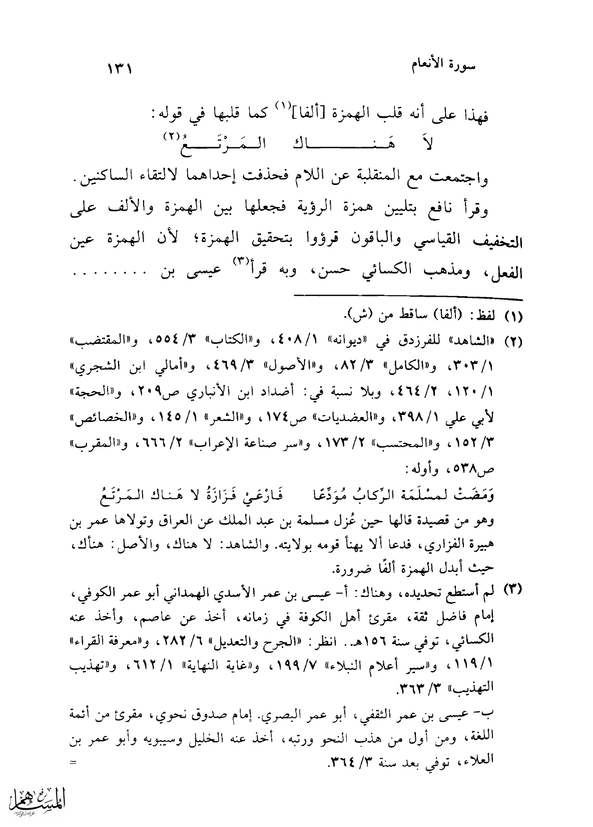 (¬3) لم أستطع تحديده، وهناك: أ- عيسى بن عمر الأسدي الهمداني أبو عمر الكوفي، إمام فاضل ثقة، مقرئ أهل الكوفة في زمانه، أخذ عن عاصم، وأخذ عنه الكسائي، توفي سنة 156 هـ. انظر: "الجرح والتعديل" 6/ 282، و"معرفة القراء" 1/ 119، و"سير أعلام النبلاء" 7/ 199، و"غاية النهاية" 1/ 612، و"تهذيب التهذيب" 3/ 363.
