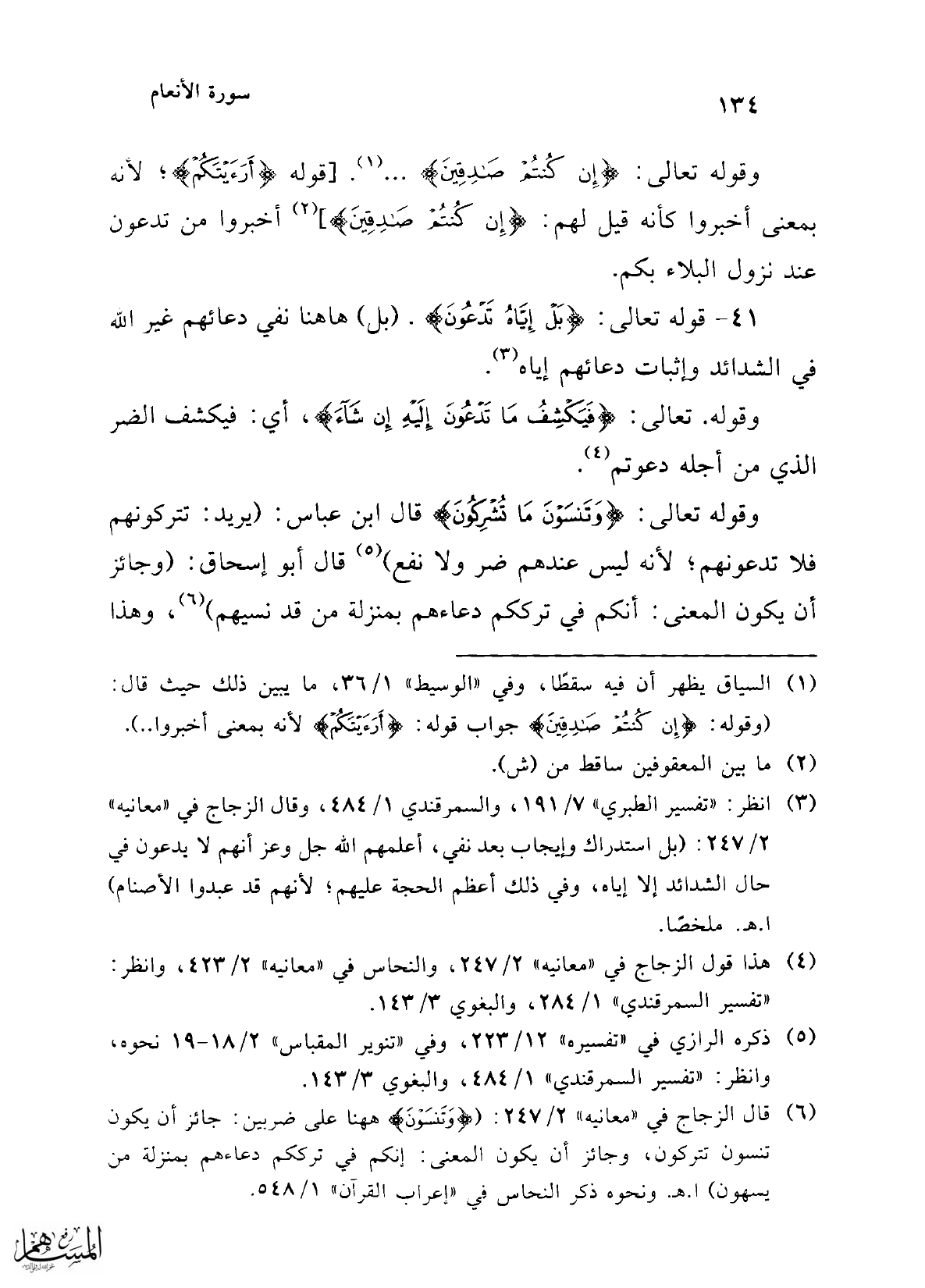 وقوله تعالى: {وَتَنْسَوْنَ مَا تُشْرِكُونَ} قال ابن عباس: (يريد: تتركونهم فلا تدعونهم؛ لأنه ليس عندهم ضر ولا نفع) (¬5) قال أبو إسحاق: (وجائز أن يكون المعنى: أنكم في ترككم دعاءهم بمنزلة من قد نسيهم) (¬6)، وهذا