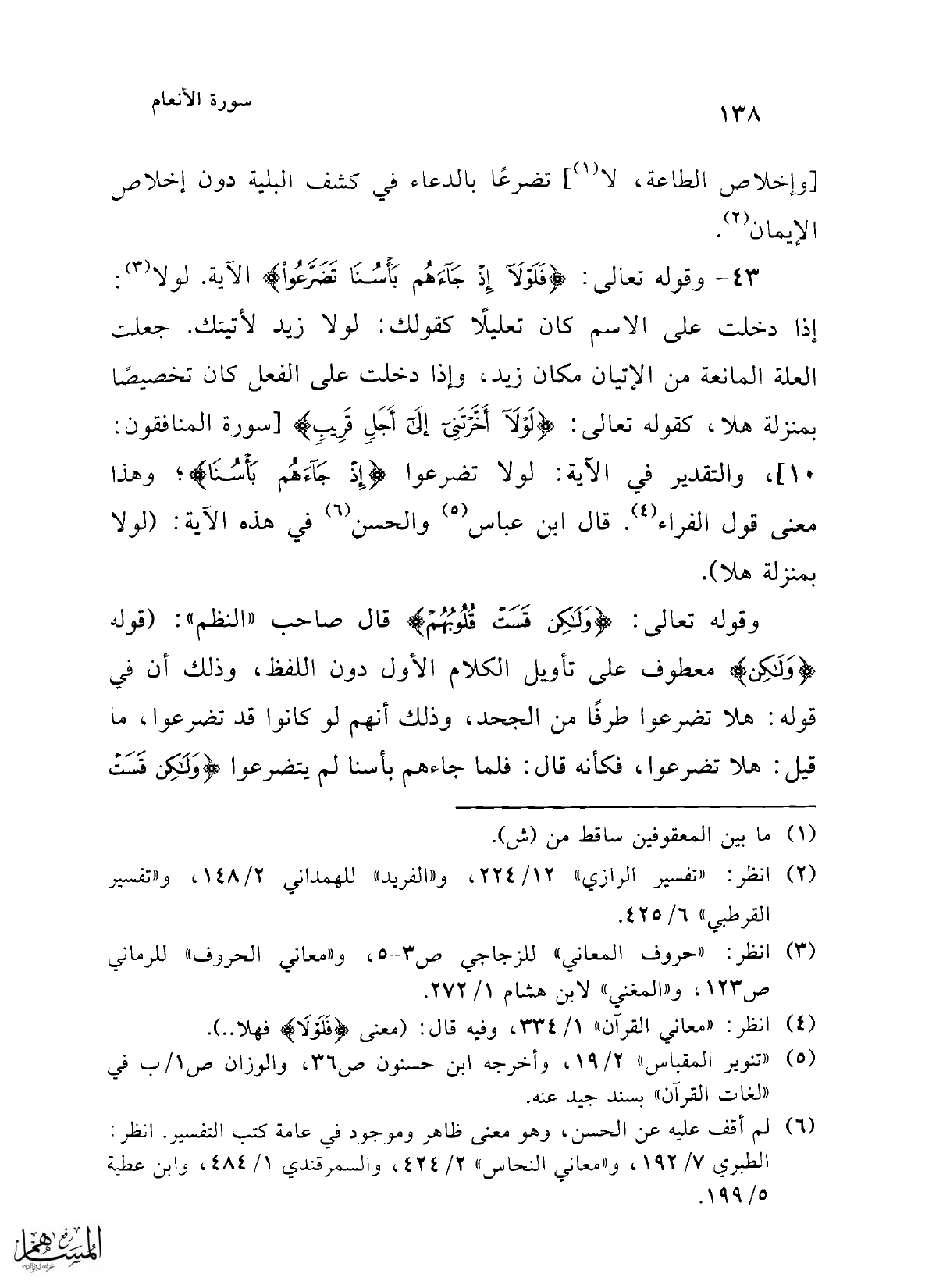 43 - وقوله تعالى: {فَلَوْلَا إِذْ جَاءَهُمْ بَأْسُنَا تَضَرَّعُوا} الآية. لولا (¬3). إذا دخلت على الاسم كان تعليلًا كقولك: لولا زيد لأتيتك. جعلت العلة المانعة من الإتيان مكان زيد، وإذا دخلت على الفعل كان تخصيصًا بمنزلة هلا، كقوله تعالى: {لَوْلَا أَخَّرْتَنِي إِلَى أَجَلٍ قَرِيبٍ} [المنافقون: 10]، والتقدير في الآية: لولا تضرعوا {إِذْ جَاءَهُمْ بَأْسُنَا}؛ وهذا معنى قول الفراء (¬4). قال ابن عباس (¬5) والحسن (¬6) في هذه الآية: (لولا بمنزلة هلا).