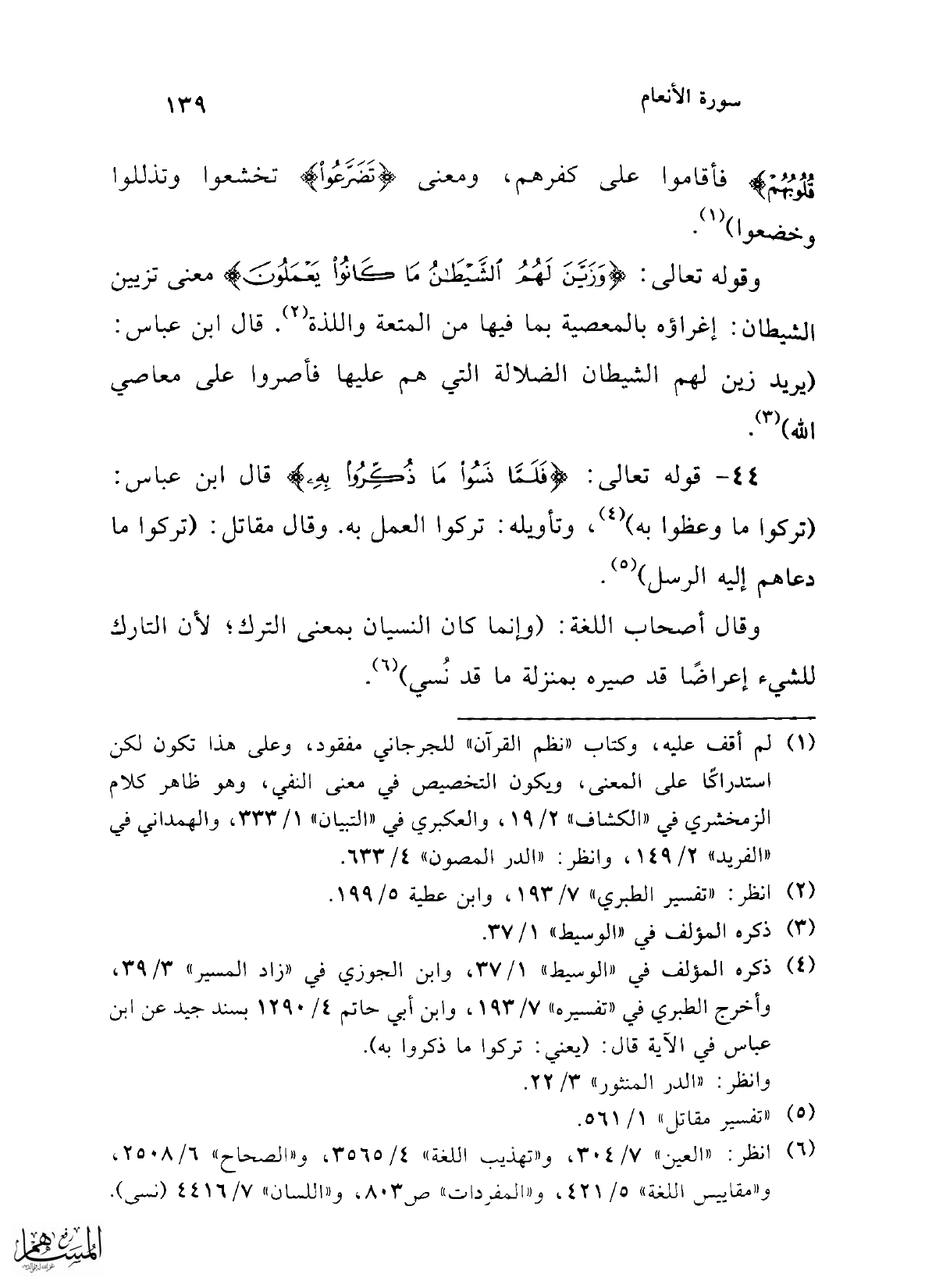 (¬6) انظر: "العين" 7/ 304، و"تهذيب اللغة" 4/ 3565، و"الصحاح" 6/ 2508، و"مقاييس اللغة" 5/ 421، و"المفردات" ص 803، و"اللسان" 7/ 4416 (نسى).
