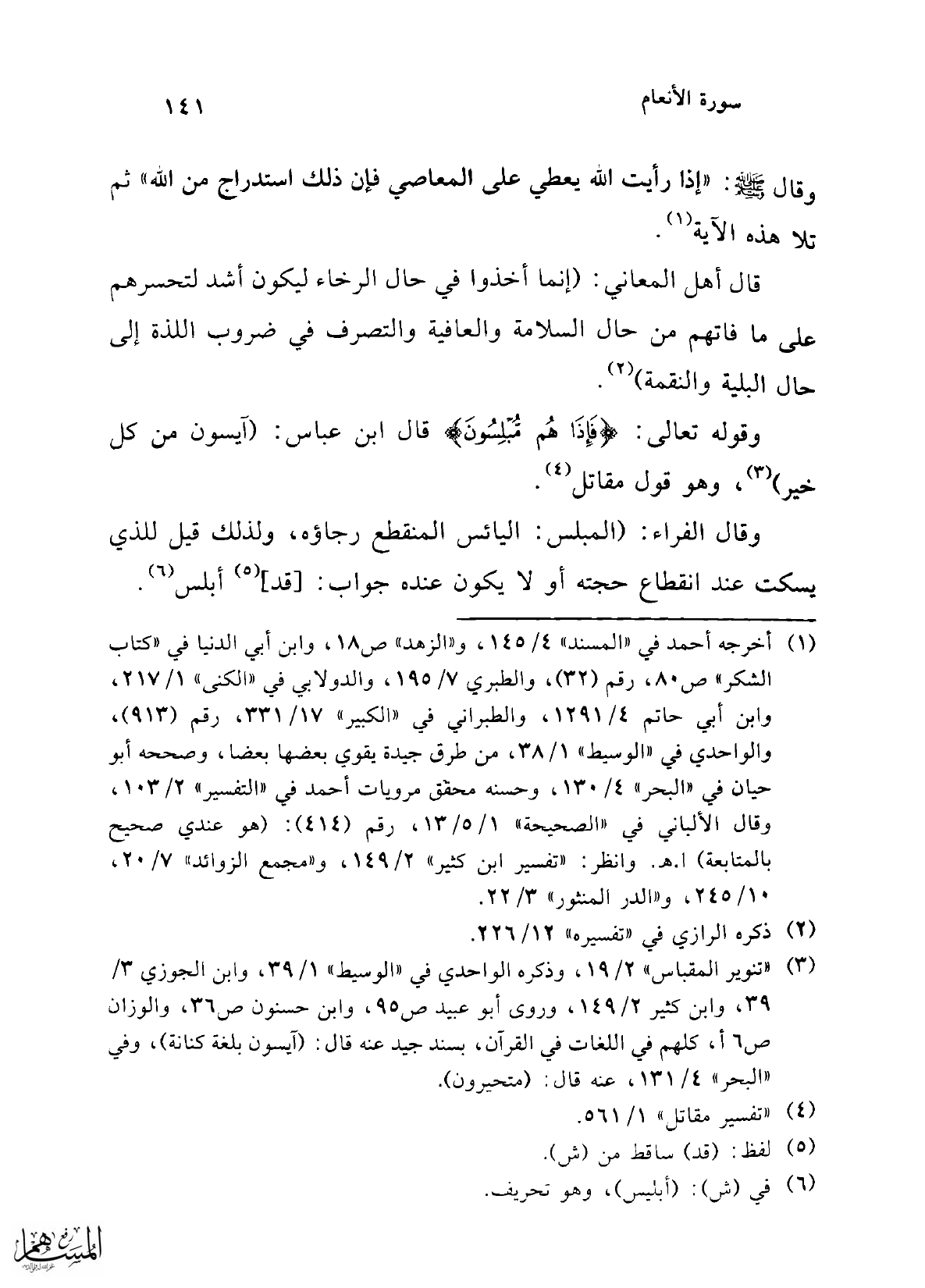 وقال الفراء: (المبلس: اليائس المنقطع رجاؤه، ولذلك قيل للذي يسكت عند إنقطاع حجته أو لا يكون عنده جواب: [قد] (¬5) أبلس (¬6).