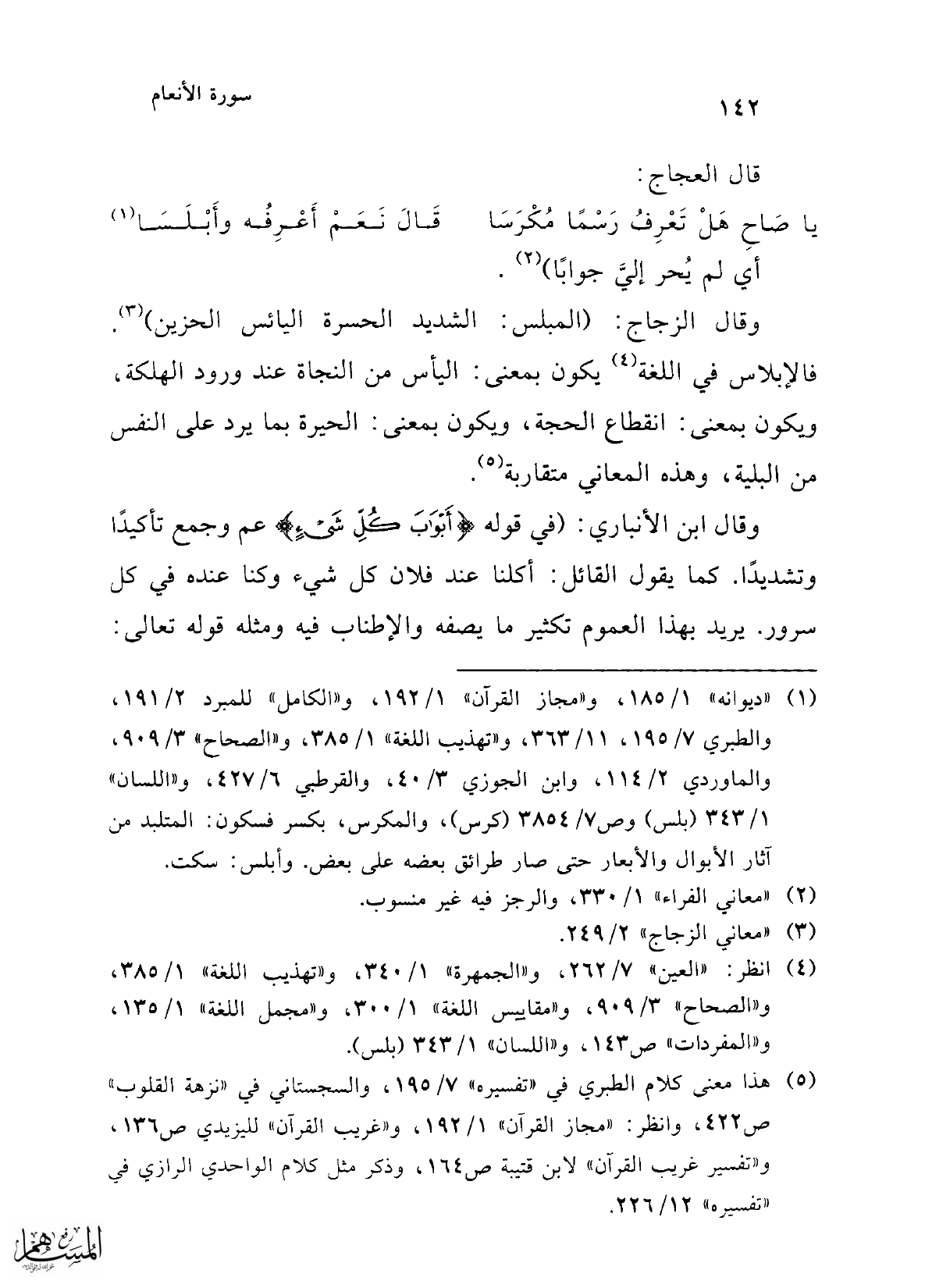 وقال الزجاج: (المبلس: الشديد الحسرة اليائس الحزين) (¬3). فالإبلاس في اللغة (¬4) يكون بمعنى: اليأس من النجاة عند ورود الهلكة، ويكون بمعنى: انقطاع الحجة، ويكون بمعنى: الحيرة بما يرد على النفس من البلية، وهذه المعاني متقاربة (¬5).